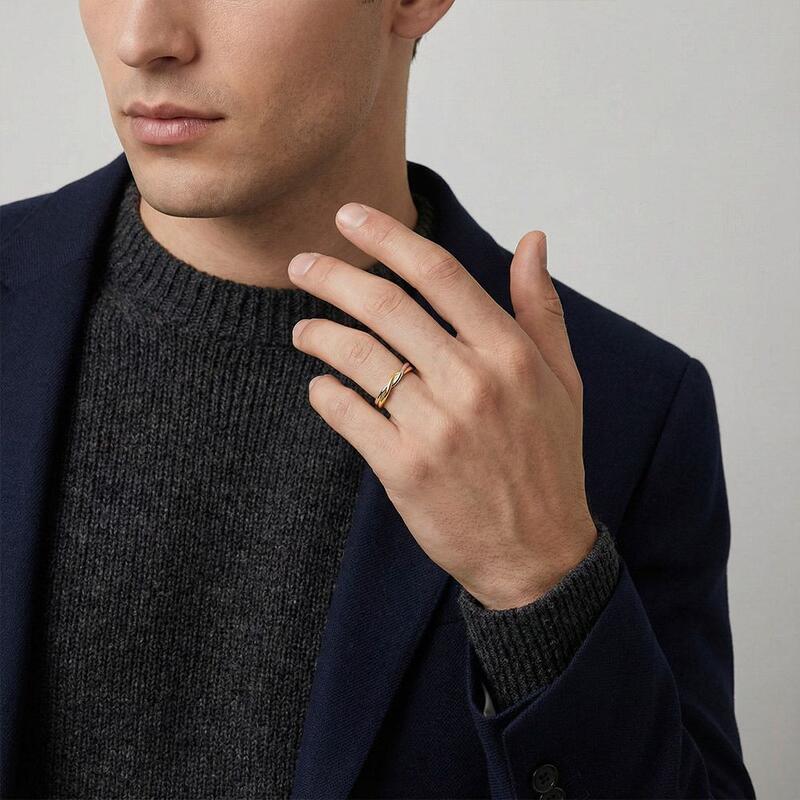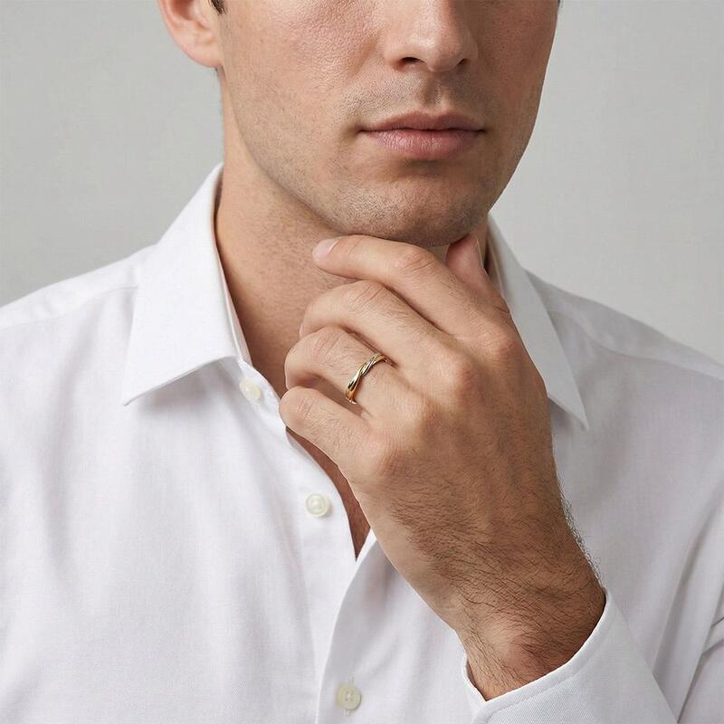 Une déclaration audacieuse mais raffinée d'unité, cette alliance pour homme entrelace des brins torsadés et élégants de métaux contrastés, symbolisant le lien indestructible de l'amour. La texture dynamique ajoute de la profondeur et du mouvement, tandis que la fusion harmonieuse des finitions crée une élégance masculine et moderne. Intemporelle mais distinctive, elle est conçue pour accompagner le voyage de la vie avec une sophistication sans effort.