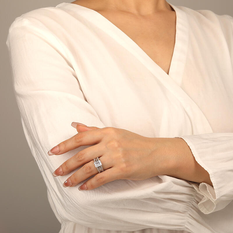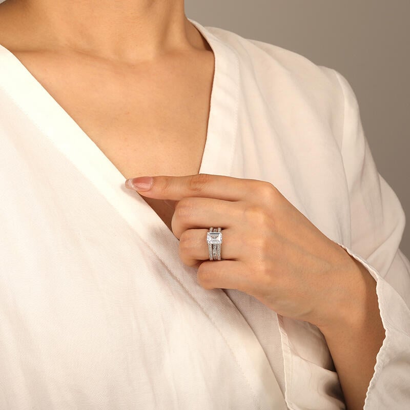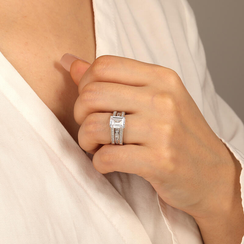 Ce set nuptial étincelant vous ensorcellera. La pierre centrale taille radiant brille sur la couronne, tandis que l'auréole discrète et les épaules pavées assurent un scintillement omnidirectionnel. L'alliance assortie à sertissage rail avec pierres princesse permet des combinaisons personnalisables. D'une simplicité éblouissante, cet ensemble fera de votre épouse l'incarnation même de la grâce.