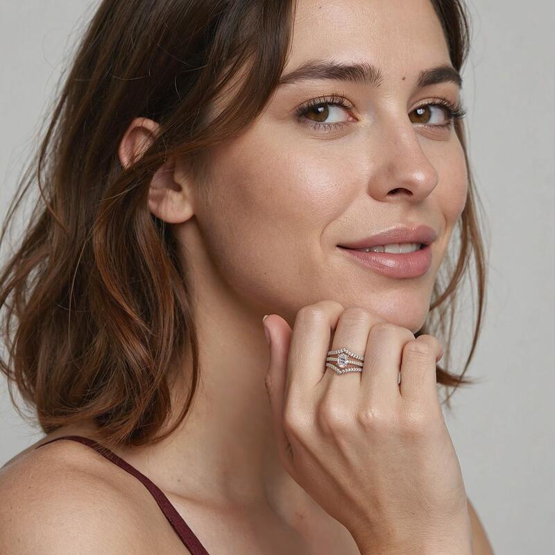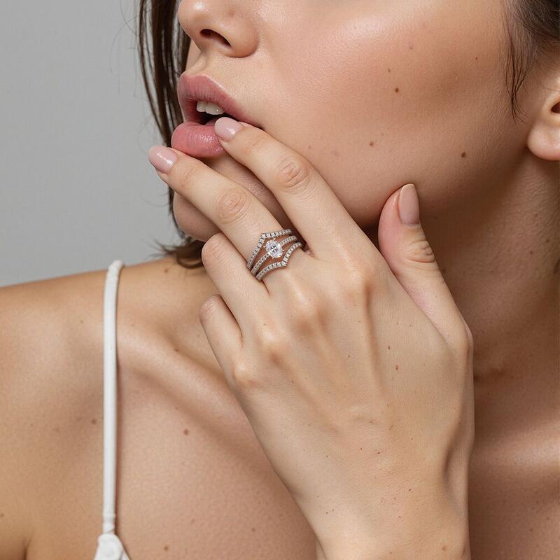 Ce somptueux set bridal allie l'élégance intemporelle à la sophistication moderne. La pièce maîtresse est une bague de fiançailles ovale dont les pierres cachées ajoutent une touche de mystère, tandis que le pavé du monture scintille d'un délicat éclat. Associé à un enchanteur pavé en chevron, l'ensemble crée une silhouette harmonieuse et rayonnante, symbolisant l'union et l'amour éternel - parfait pour les moments les plus précieux d'une mariée.