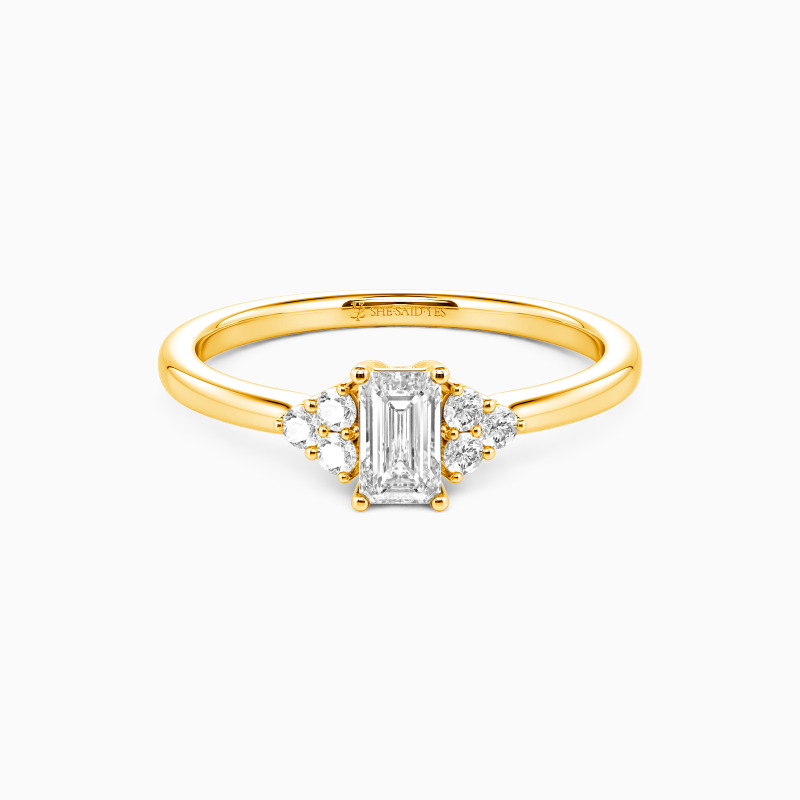Cette bague à pierres latérales met en vedette une pierre centrale émeraude, alliant élégance classique et design contemporain. Flanquée de chaque côté par des groupes de trois pierres rondes, cette disposition crée un équilibre entre raffinement et éclat. Cette combinaison de précision géométrique et d’une touche de fantaisie façonne une pièce qui symbolise un amour à la fois durable et en constante évolution.