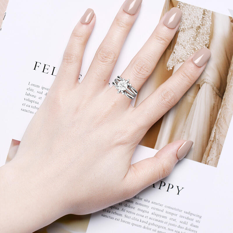 Un solitaire classique à taille ronde prend place au cœur de cette parure de mariage, ses lignes épurées symbolisant un amour éternel. L’enhancer inspiré des couronnes—serti de pierres rondes étincelantes—ajoute une touche de sophistication royale, permettant une transformation aisée entre la simplicité diurne et l’opulence nocturne. Conçu pour la polyvalence, cet ensemble allie tradition et élégance contemporaine, sublimant chaque instant.
