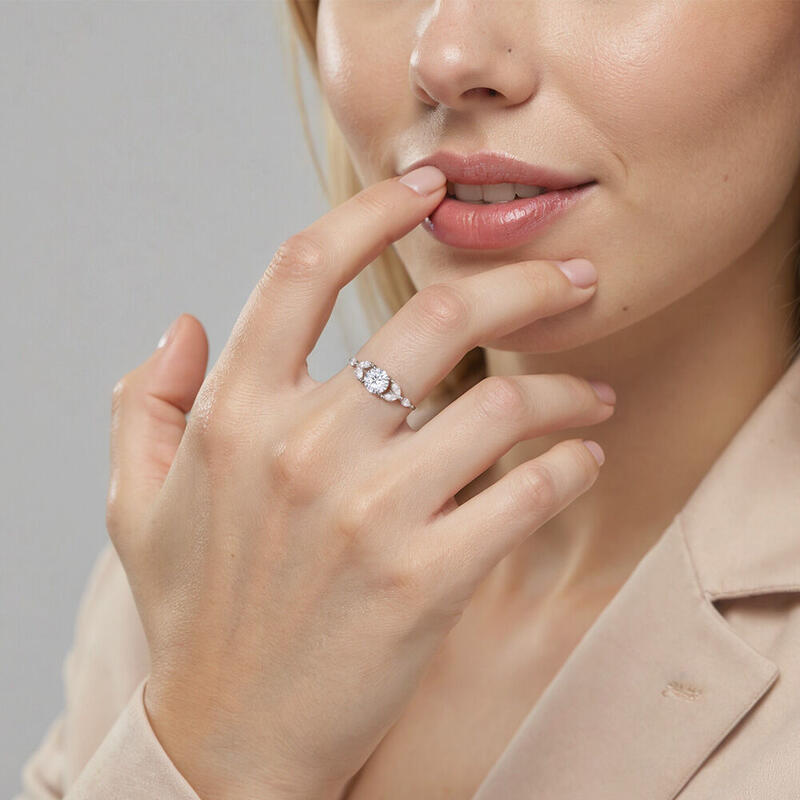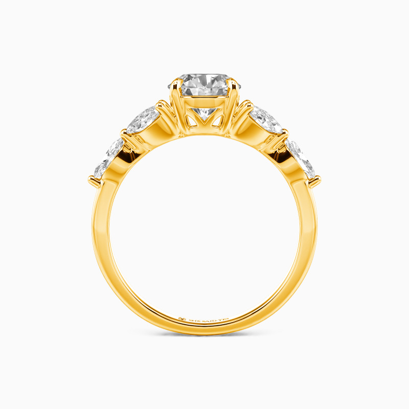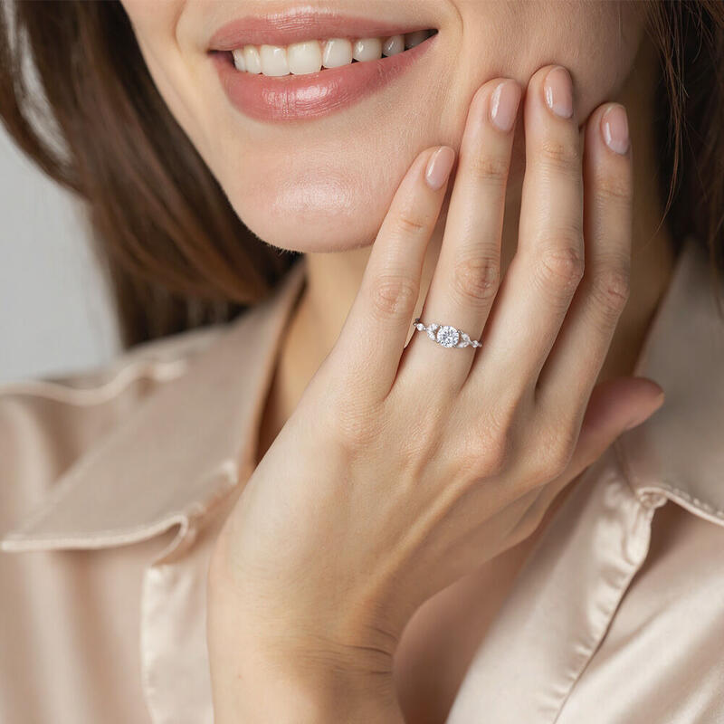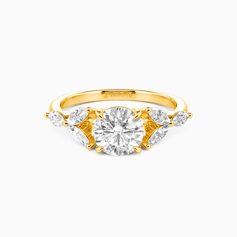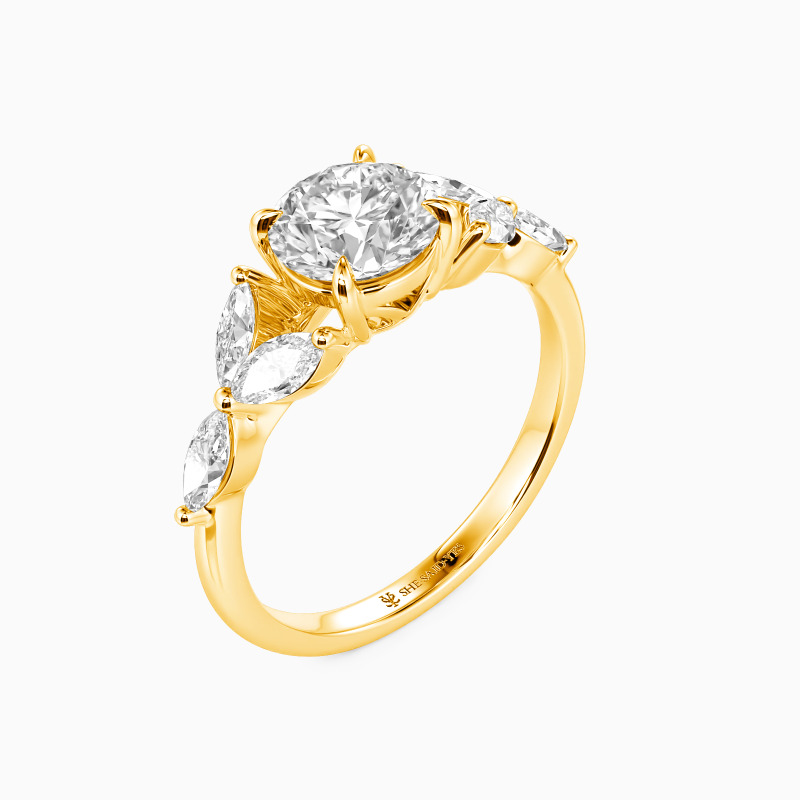 Profitez de chaque rayon de l'éclat de notre magnifique bague de fiançailles à pierres latérales. Elle présente une pierre centrale ronde frappante et plusieurs pierres précieuses marquise brillantes le long du shank fuselé pour un éclat supplémentaire. Créez une ambiance rétro distinctive et offrez-vous une esthétique captivante.