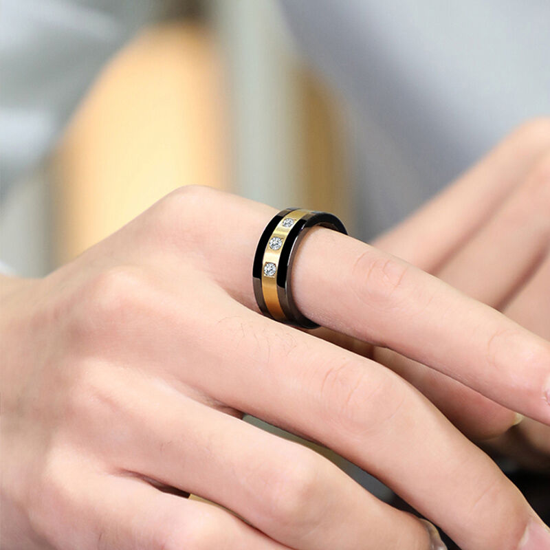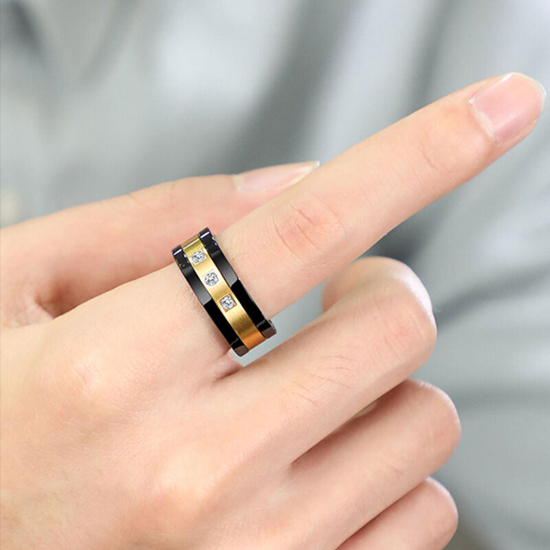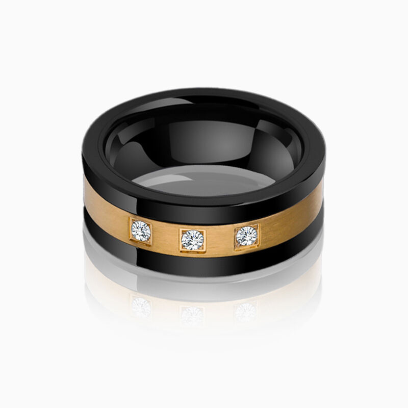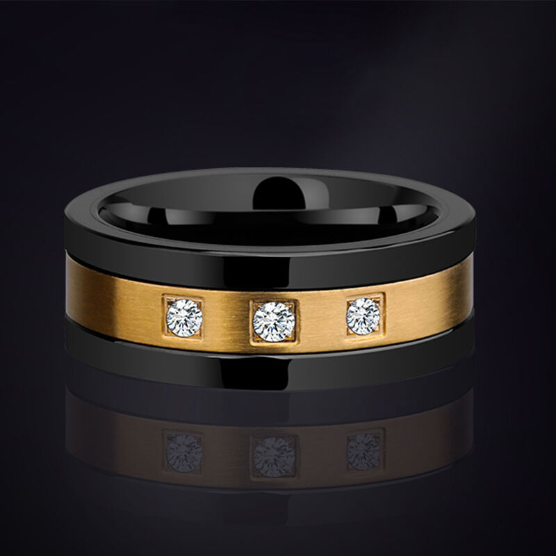 Cette bague de mariage pour homme allie avec maîtrise un style contemporain à une sophistication intemporelle. La base en céramique de zircon noire profonde offre une finition élégante, tandis qu'une bande centrale plaquée or brossé apporte un contraste chaleureux. Trois pierres étincelantes créent des points focaux brillants, jouant avec la lumière et les textures. Les bords polis miroir assurent un port confortable, alliant esthétique captivante et ergonomie.