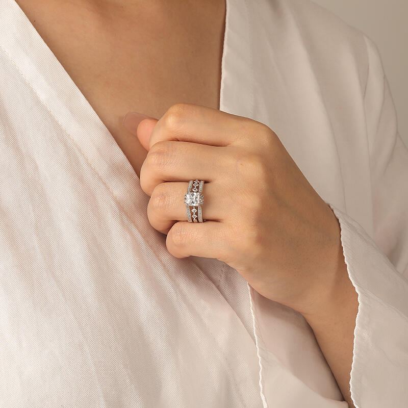 Ce set nuptial interchangeable réinvente le style rétro. Deux rubans pavés de pierres scintillantes encadrent une pierre centrale taille radiant exceptionnelle. Les alliances assorties à rangée de pierres princesse cristallisent la quintessence romantique. Un chef-d'œuvre qui sublime les derniers frémissements de votre cœur amoureux.