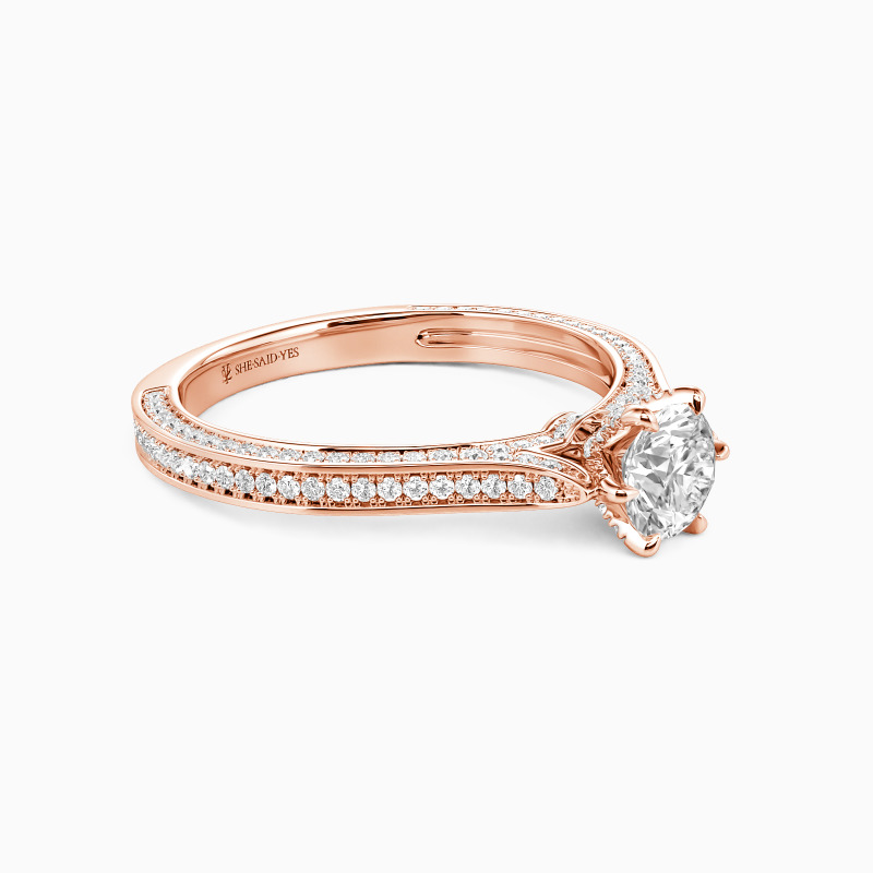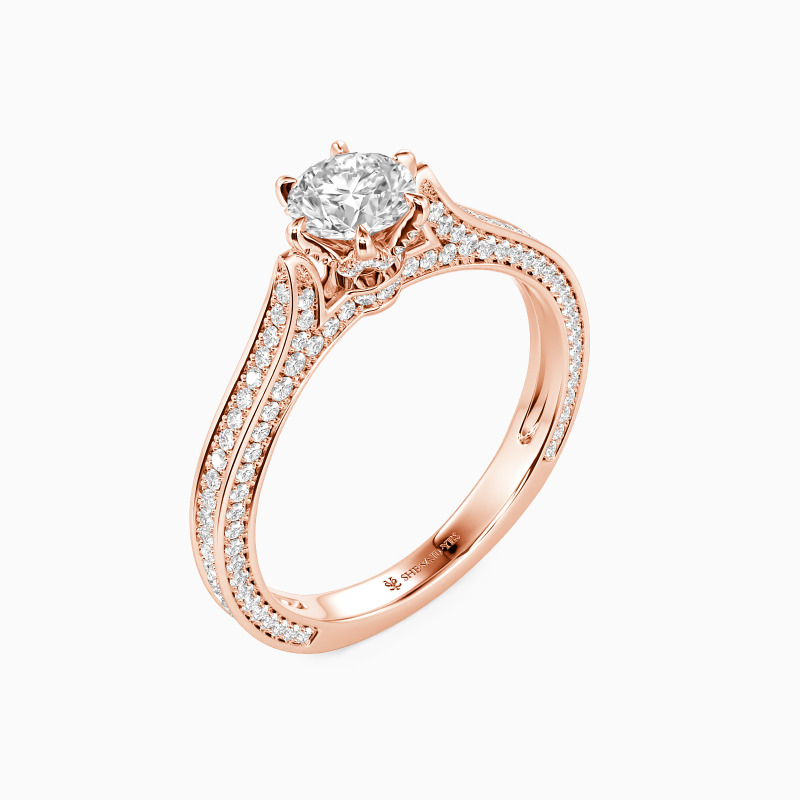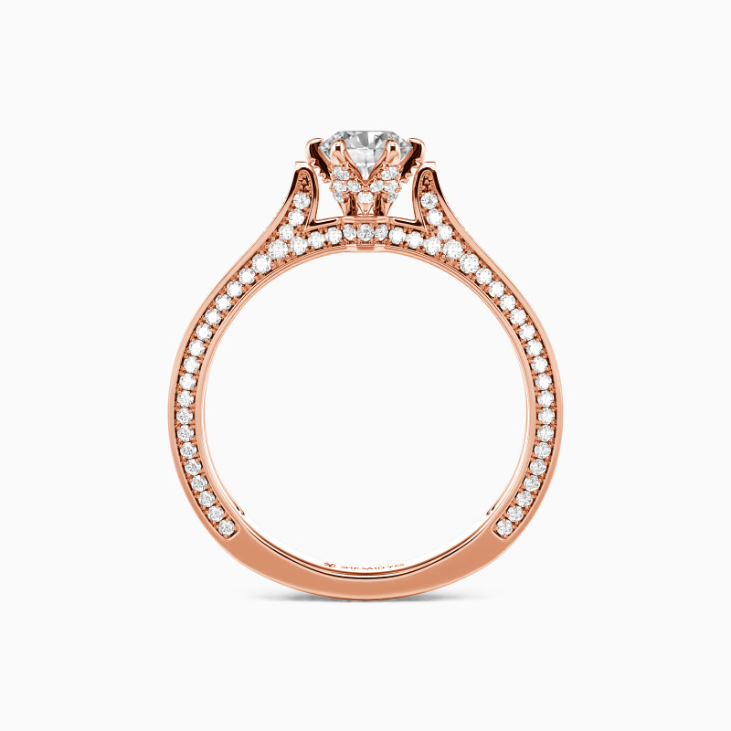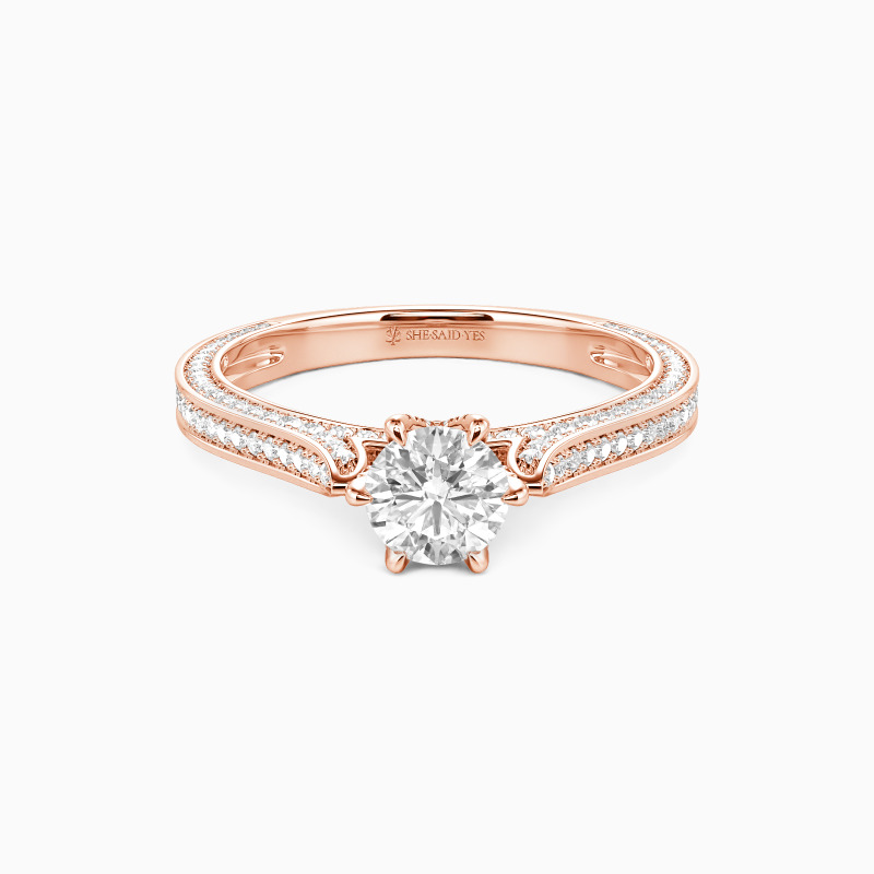 Un centre rond étincelant, enveloppé de six griffes, révèle une brillance infinie. Les délicates incrustations pavées de chaque côté du monture confèrent au ring une élégance intemporelle et épurée. Depuis que je t’ai rencontrée, tu es ma reine, et je promets de me battre pour toi, pour toujours.