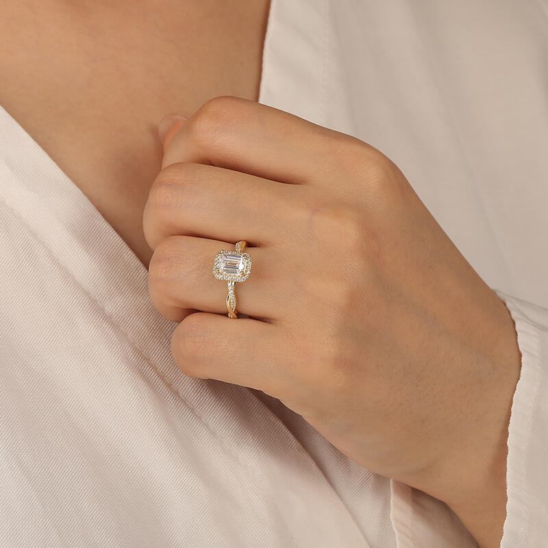Cette bague de fiançailles halo présente une pierre centrale taille émeraude enveloppée d'un halo radieux. Des rangées de pierres précieuses s'entrelaçant avec un ruban métallique incarnent l'élégance contemporaine. Un hommage à l'amour éternellement resplendissant.