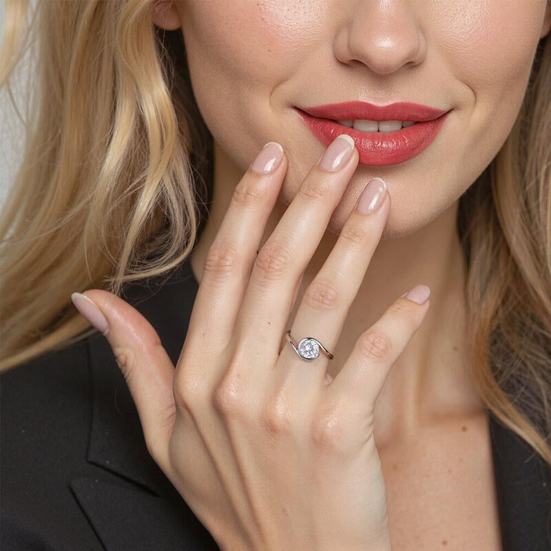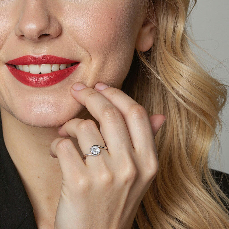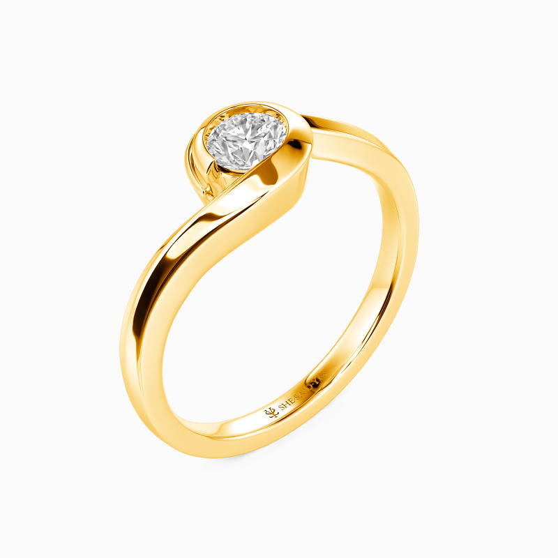 Le design ondulé révèle la beauté voluptueuse de cette bague de fiançailles délicate. Centrée sur une pierre taille ronde scintillante entièrement enveloppée par un serti précieux prolongeant le jonc fluide, ce look contemporain incarne votre charisme captivant et sculpte le message d'un amour éternel.