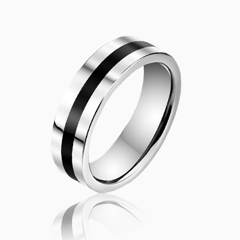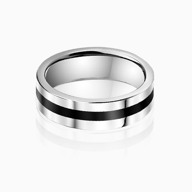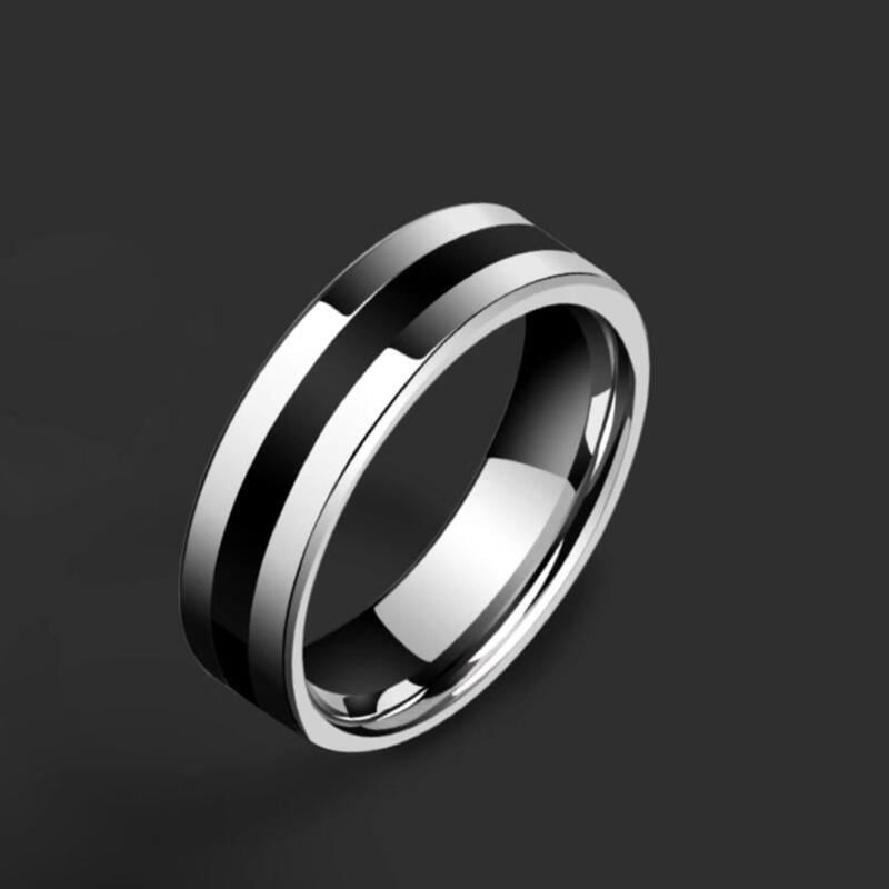 Cette bague de mariage masculine contemporaine redéfinit la masculinité moderne avec une base en carbure de tungstène argenté et une bande en silicone noir incrustée en surface. Le contraste géométrique saisissant crée une profondeur visuelle, tandis que la silhouette droite garde le design épuré et actuel.