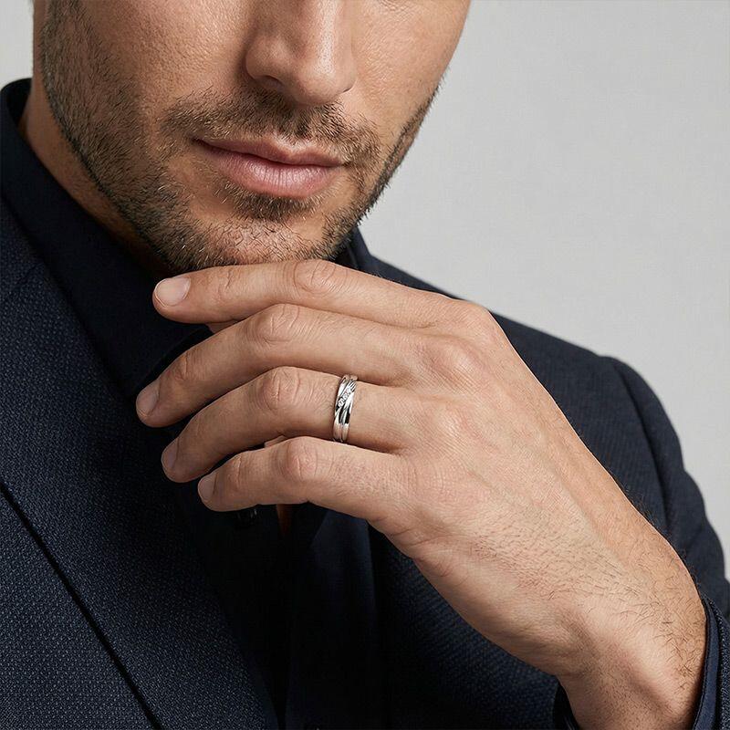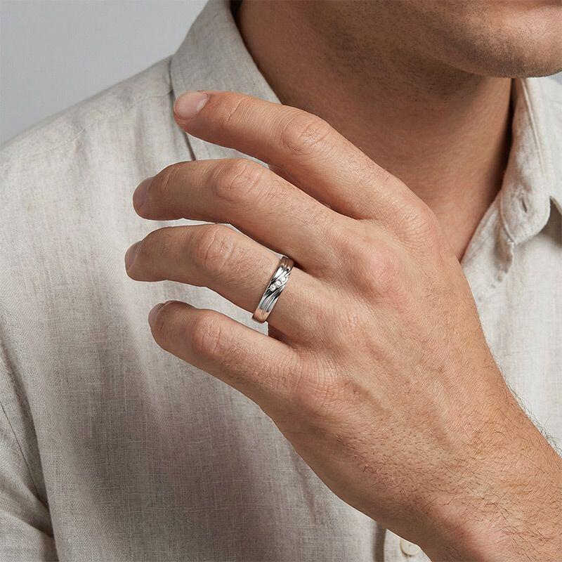 Simple mais élégante. Cette alliance pour homme séduira votre bien-aimé d'un regard. Fabriquée dans un bandeau métallique poli avec trois courbes sculpturales naturelles sur la surface, cette bague est rehaussée par trois pierres rondes cachées dans son design unique pour ajouter une touche d'éclat supplémentaire. Choix idéal pour les hommes amoureux.