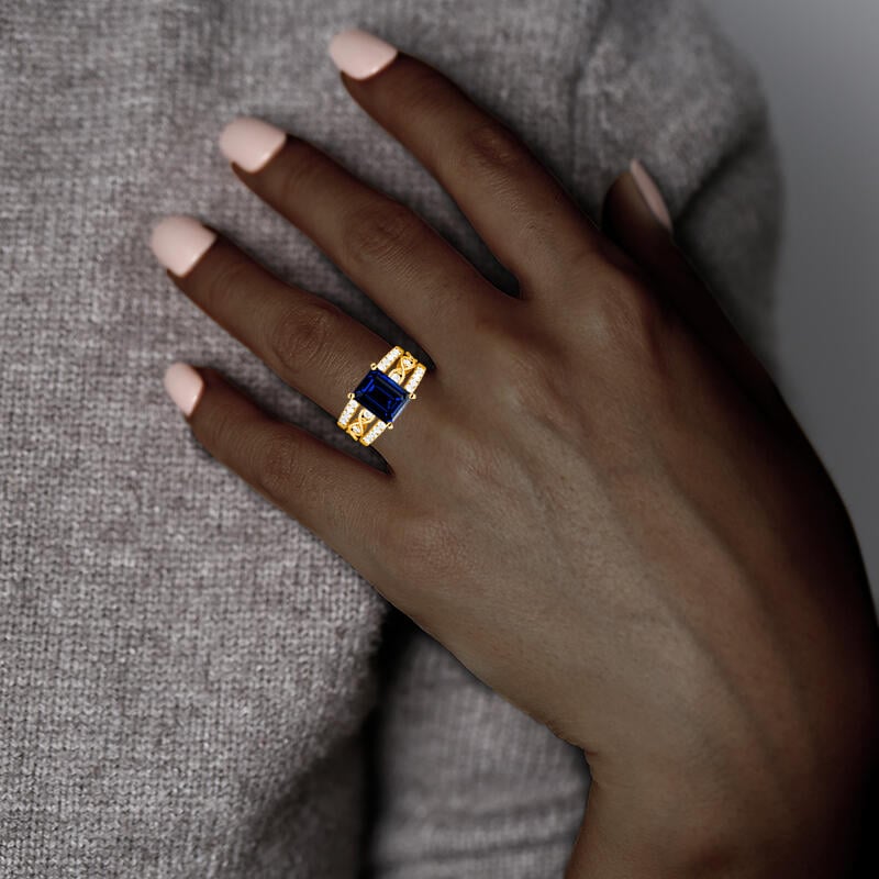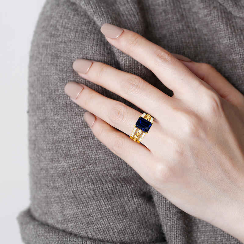 Cette parure de mariage exquise redéfinit la polyvalence avec une sophistication intemporelle. La bague de fiançailles met en valeur une pierre centrale émeraude coupée de manière frappante, encadrée par une monture délicatement festonnée scintillante de pierres rondes. Son rehausseur assorti - conçu dans un élégant style cathédrale - sublime l'ensemble avec l'éclat du pavé et des pierres cachées, ajoutant une touche de luxe discret. Parfait pour une mariée qui chérit à la fois la tradition et l'adaptabilité moderne.