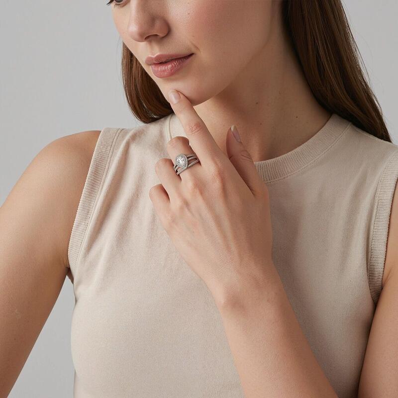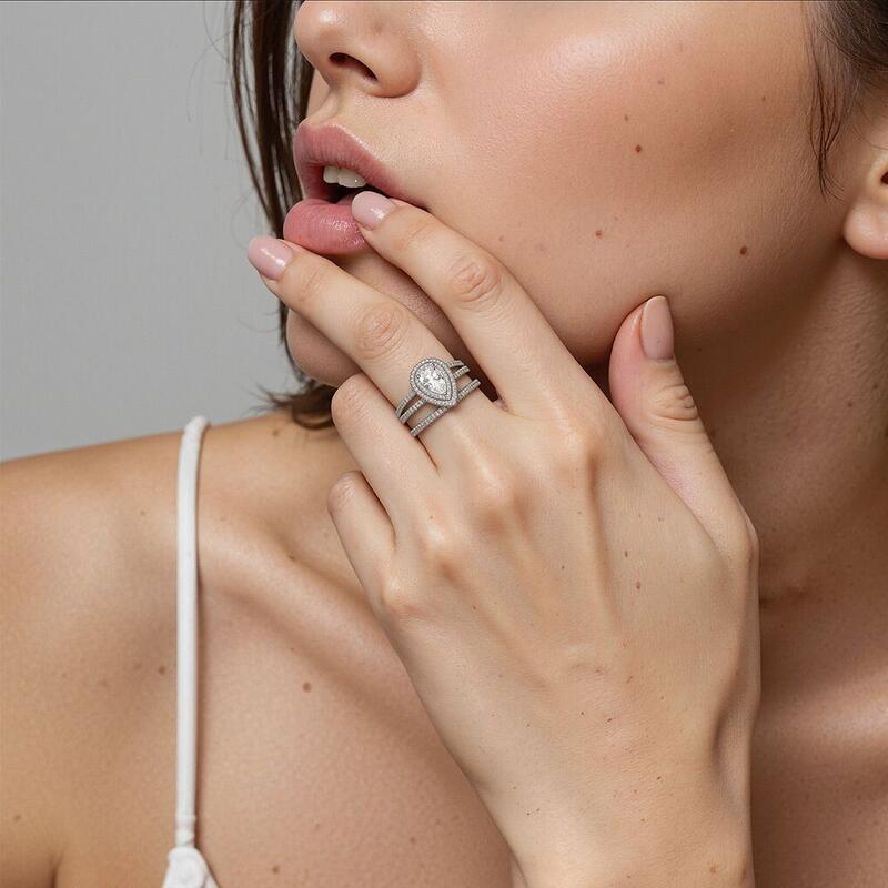 Parure nuptiale contemporaine : Une pierre en poire scintillante sertie dans un double halo sur shank divisé. L'alliance complice épouse la philosophie du minimalisme moderne, incarnant le raffinement absolu.