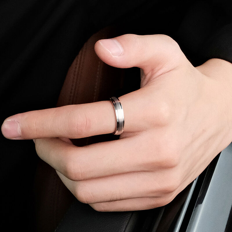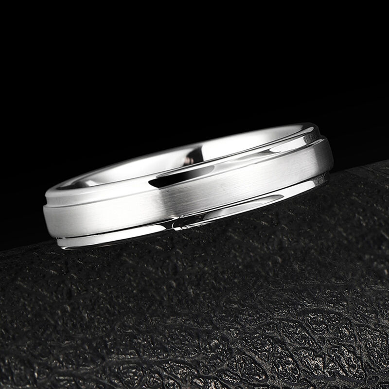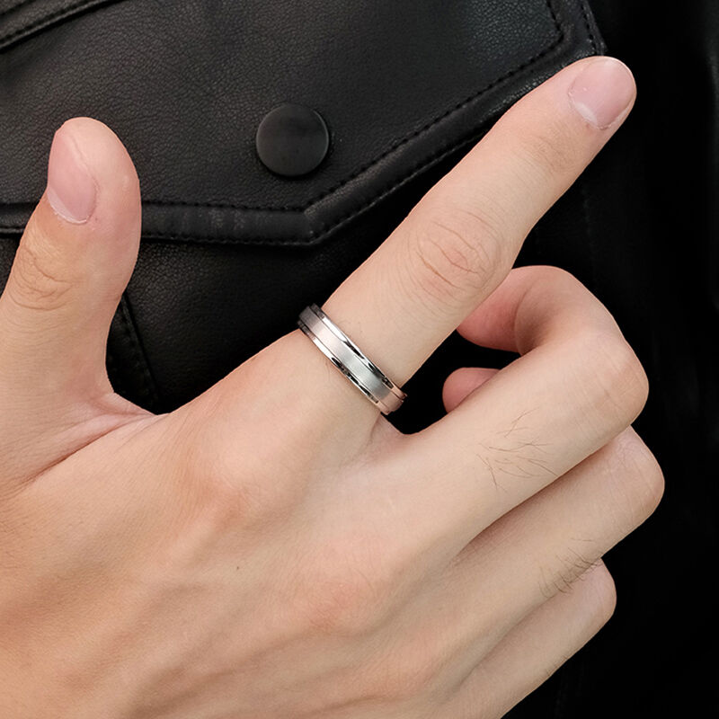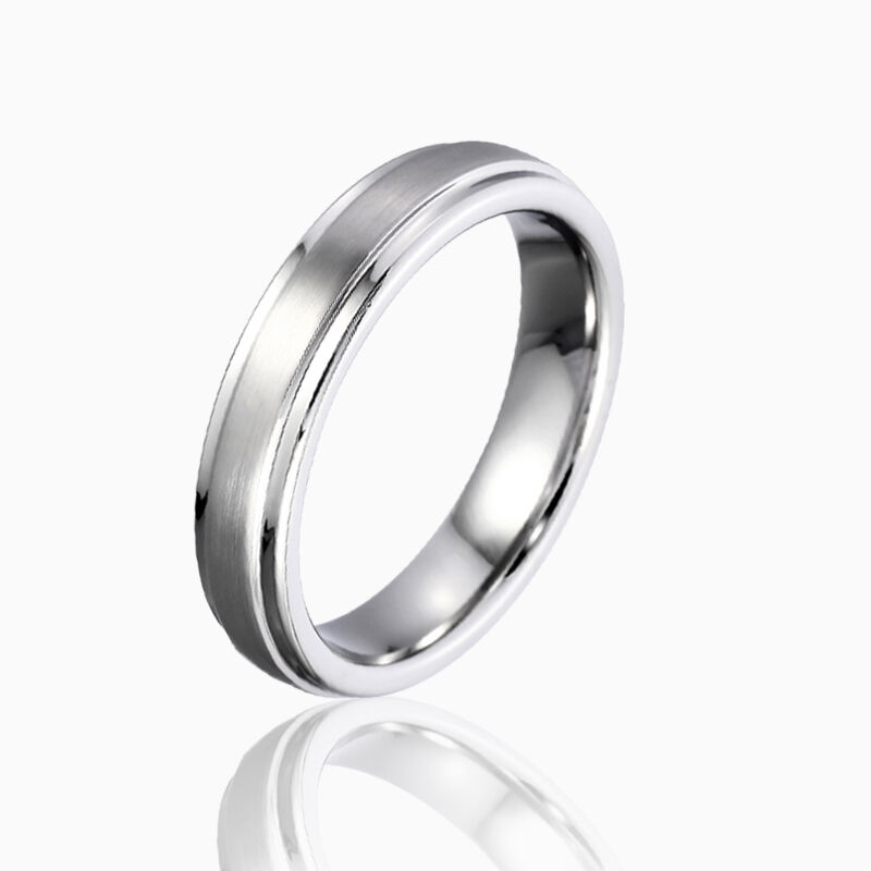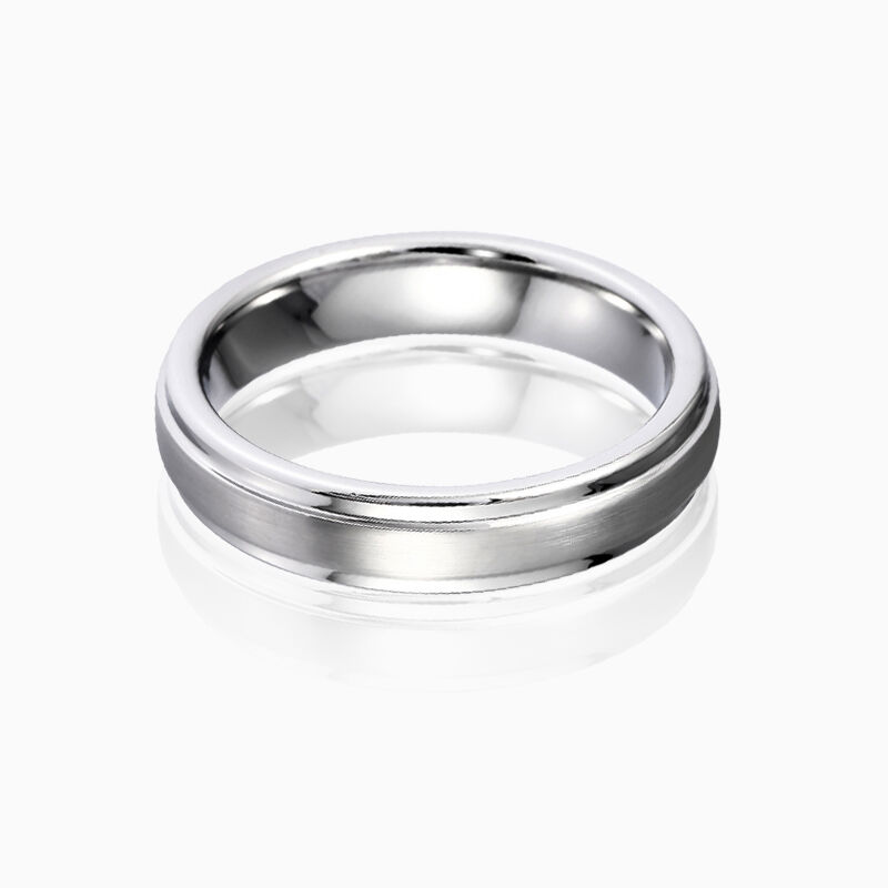Cette alliance masculine dégage une sophistication discrète avec sa finition brossée élégante, offrant une texture mate raffinée qui capte subtilement la lumière. Le détail de bord en gradin ajoute un élément architectural frappant, créant des lignes épurées et du volume pour un look moderne mais intemporel.