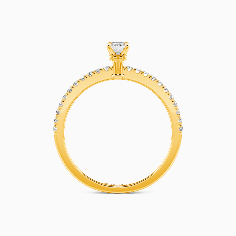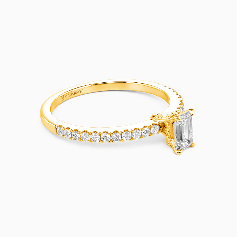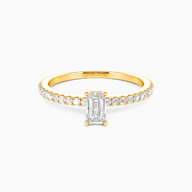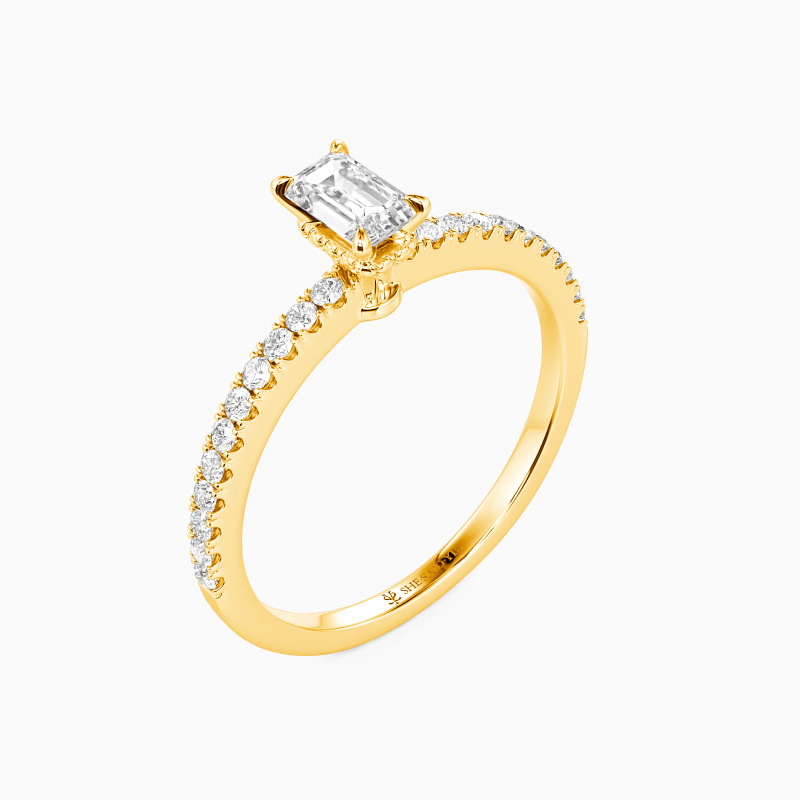 Une vision d'élégance raffinée, cette bague de fiançailles présente une pierre centrale en taille émeraude d'une beauté saisissante, dégageant une sophistication intemporelle. Le panier perlédélicat ajoute une touche de charme vintage, tandis que la bande pavé scintillante rehausse son éclat radieux. Une alliance à couper le souffle entre grâce classique et brillance moderne, conçue pour célébrer l'éclat éternel de l'amour.