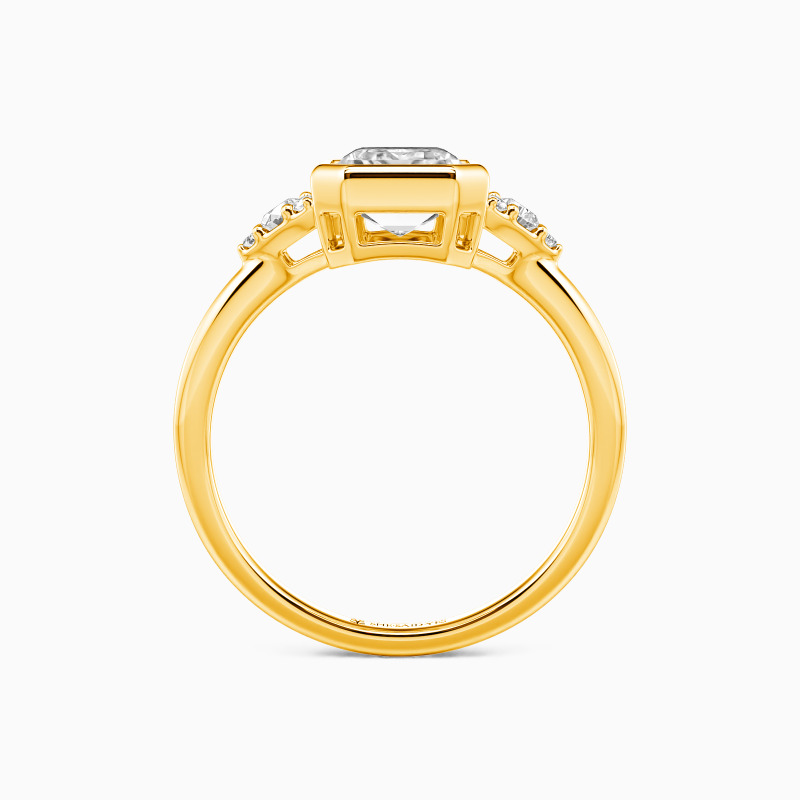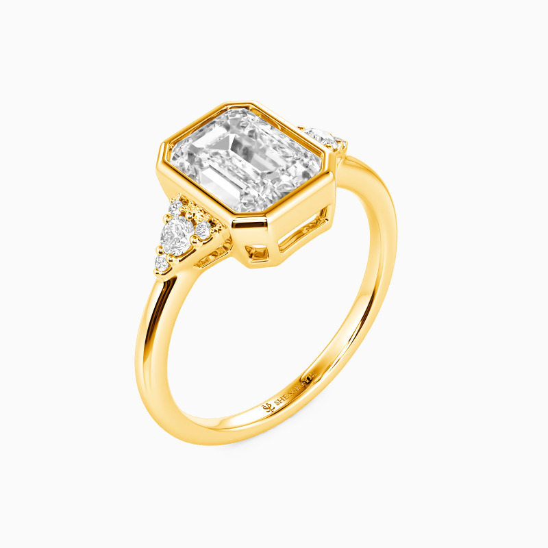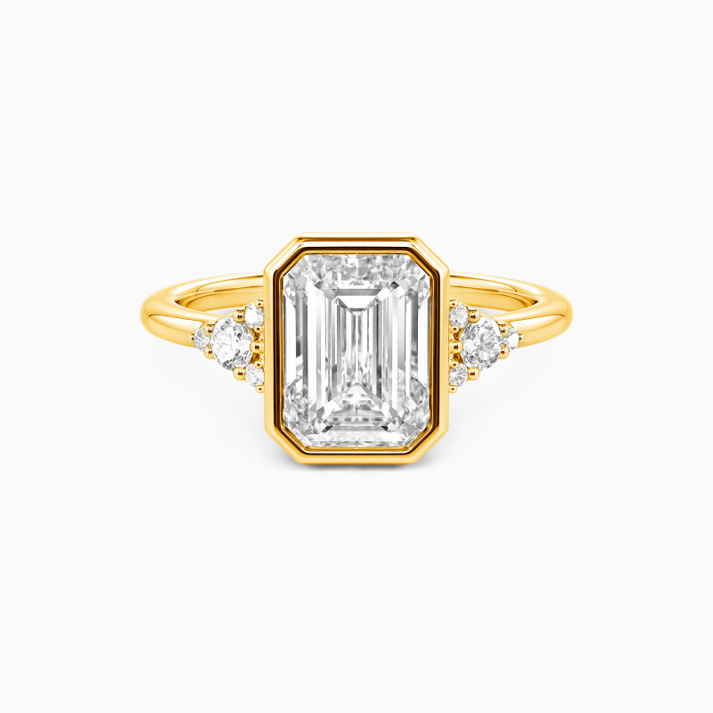 Cette élégante bague à pierres latérales célèbre l'amour avec équilibre et éclat. Un serti clos élégant présente une pierre centrale taille émeraude sereine, dont les lignes épurées évoquent la clarté et la promesse éternelle. De chaque côté, de délicats groupes de pierres rondes ajoutent un scintillement doux et festif, embrassant la vision centrale de votre avenir commun dans une symphonie harmonieuse de lumière.