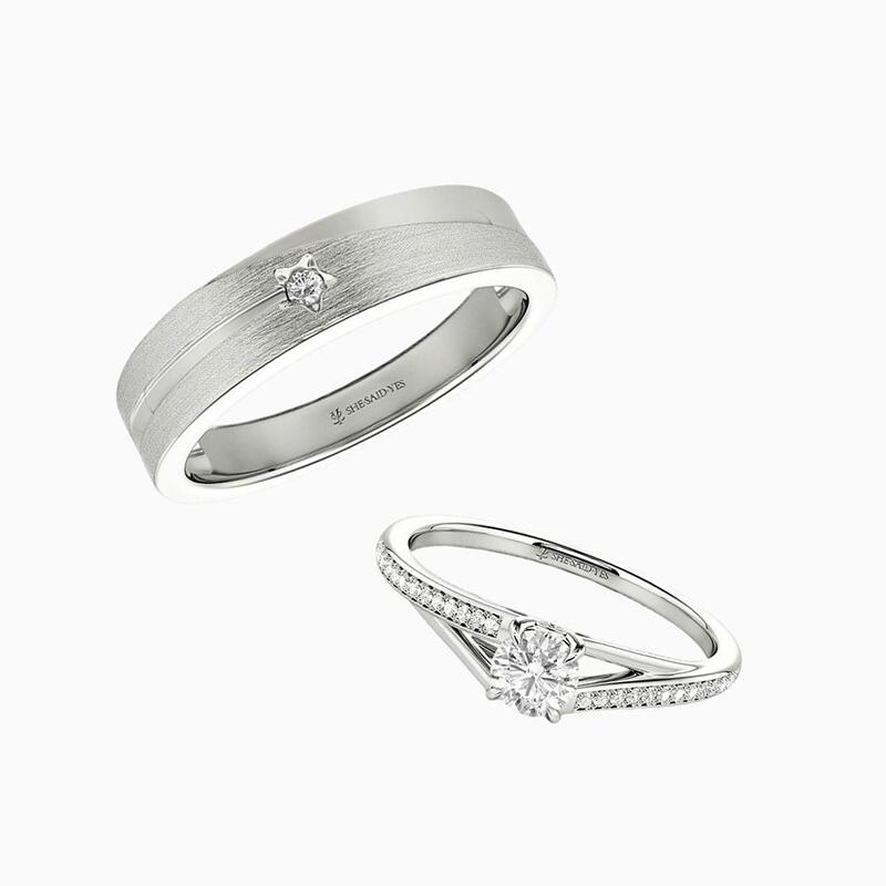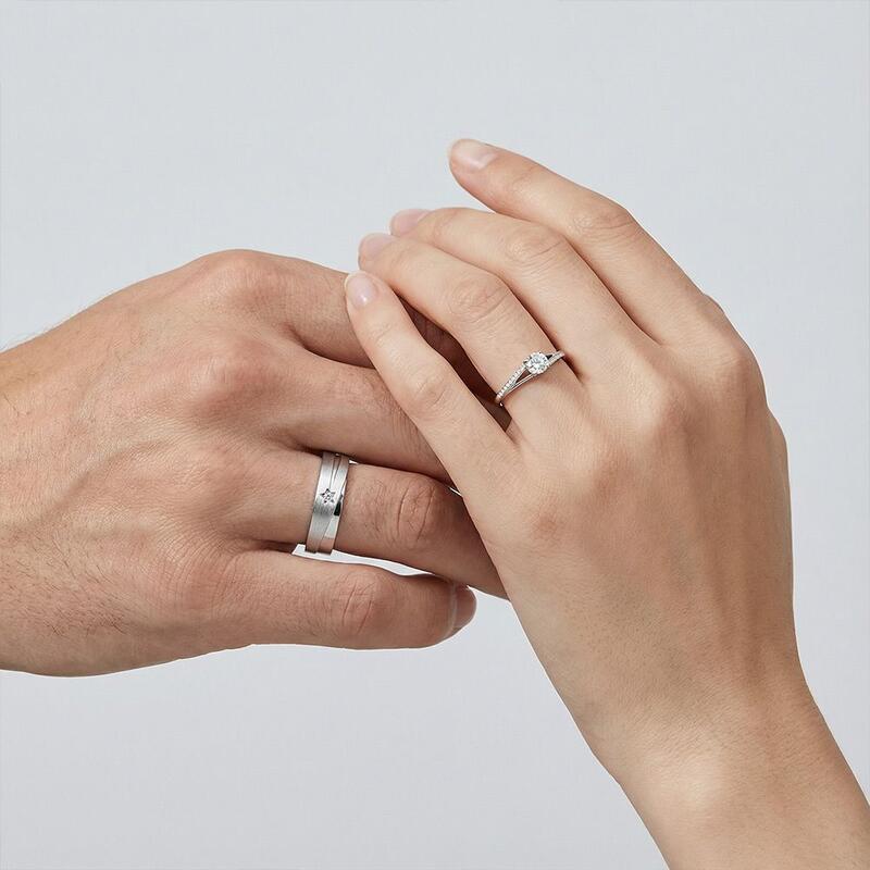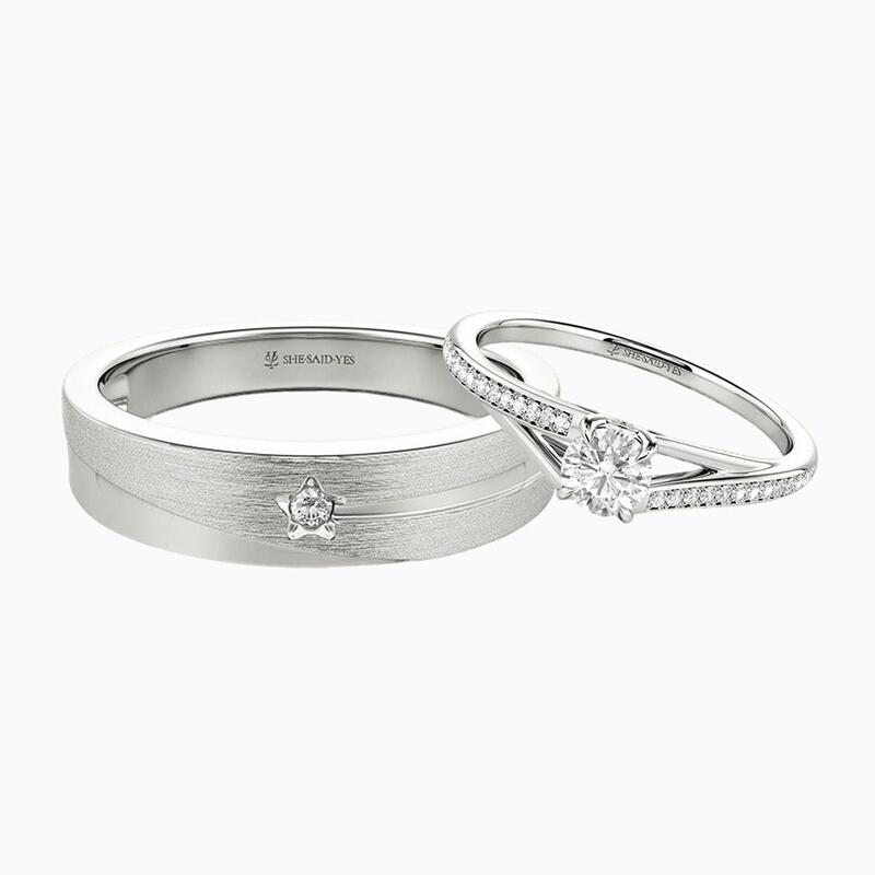 Cet ensemble captivant mêle inspiration céleste et élégance intemporelle. La bague femme arbore une pierre centrale ronde radieuse, sublimée par un montage cathédrale gracieux. Son épaulette divisée, ornée de pavé scintillant d'un côté, ajoute un charme asymétrique. La bague homme présente un motif étoilé frappant surmonté d'une pierre ronde, symbolisant leur lumière guide. Le mélange habile de finitions brossées et polies crée un look sophistiqué et dynamique.