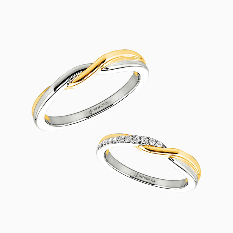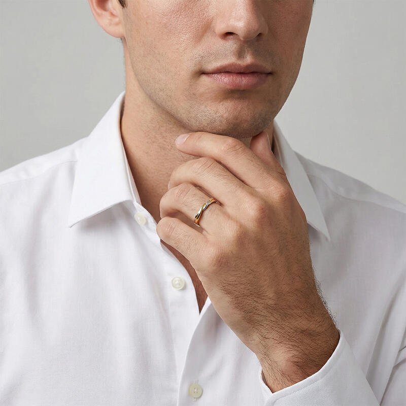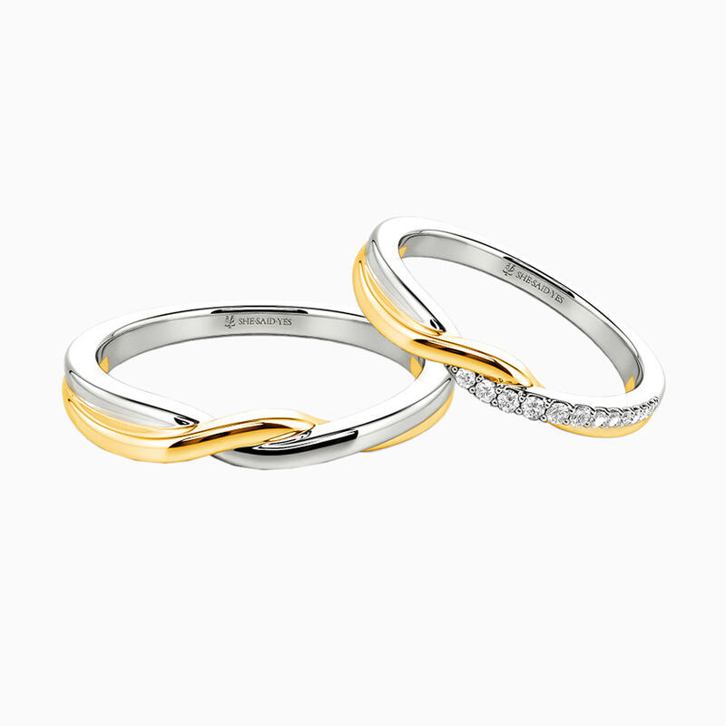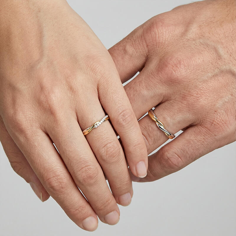 Ces alliances torsadées d'une exquise finesse symbolisent l'entrelacement de deux vies. Le fini poli miroir de l'alliance homme reflète force et clarté, tandis que la version femme scintille d'une délicate rangée de diamants le long d'une courbe – ajoutant une touche d'élégance naturelle. Mêlant les métaux dans une étreinte fluide, ces alliances captent la danse intemporelle de l'amour dans chaque courbe.