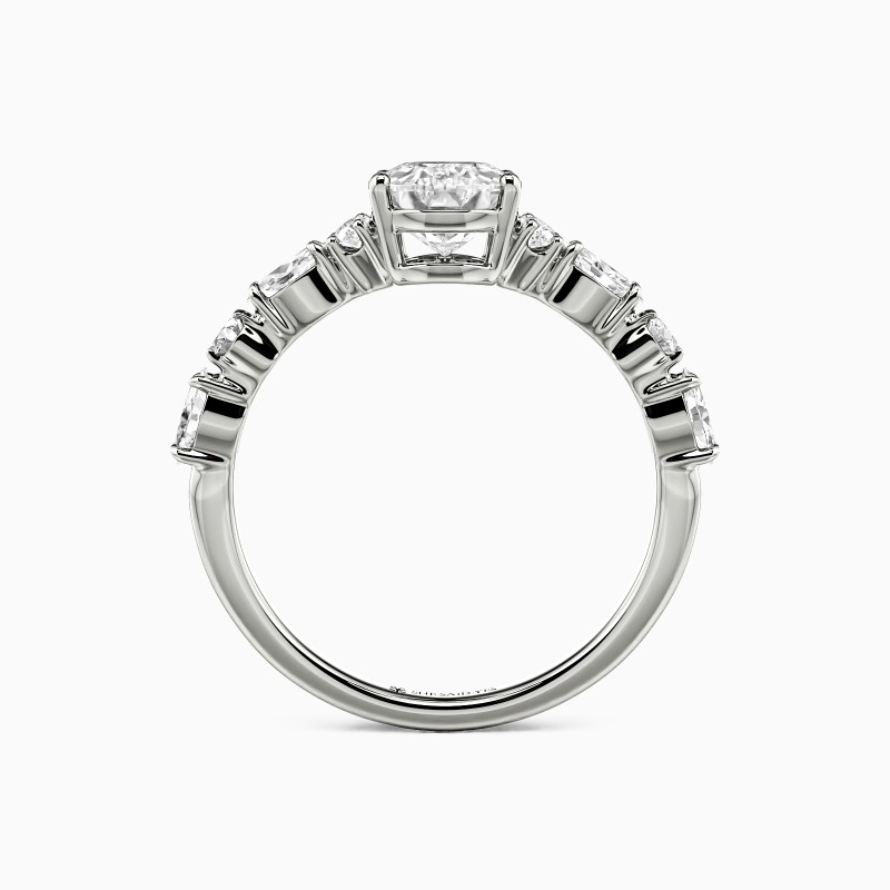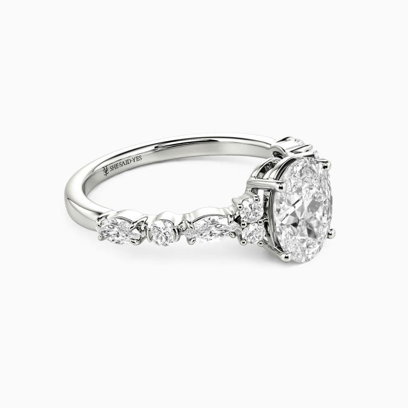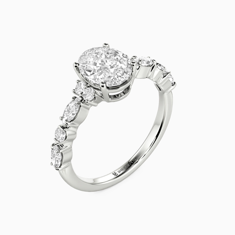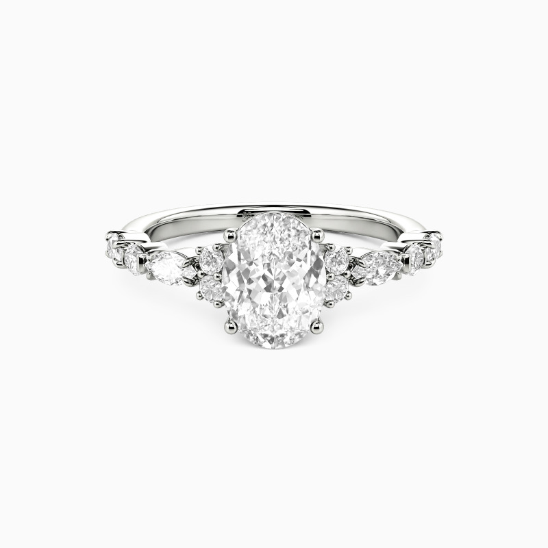 Cette bague à pierres latérales élégante met en valeur un centre ovale lumineux, gracieusement encadré par un mélange harmonieux d'accents ronds et marquise. La disposition fluide crée un cadre délicat semblable à des pétales, rehaussant les courbes douces de la pierre centrale. Le résultat est un design alliant romance discrète et brillance captivante, parfait pour un engagement intemporel.