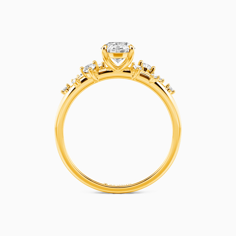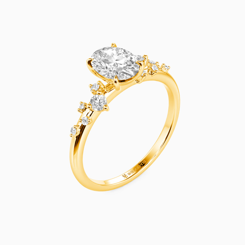Laissez-vous séduire par le savoir-faire méticuleux de cette bague de fiançailles à pierres latérales captivante. Son magnifique sertissage à quatre griffes met élégamment en valeur la pierre centrale ovale envoûtante. Ornée de cinq pierres rondes, habilement dispersées en tailles variées sur les deux côtés, elle rayonne de sophistication et d'unicité. Le branche hautement polie ajoute une touche brillante, en faisant un symbole d'amour éternel. Adoptez la beauté intemporelle avec ce chef-d'œuvre remarquable.