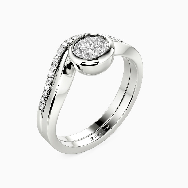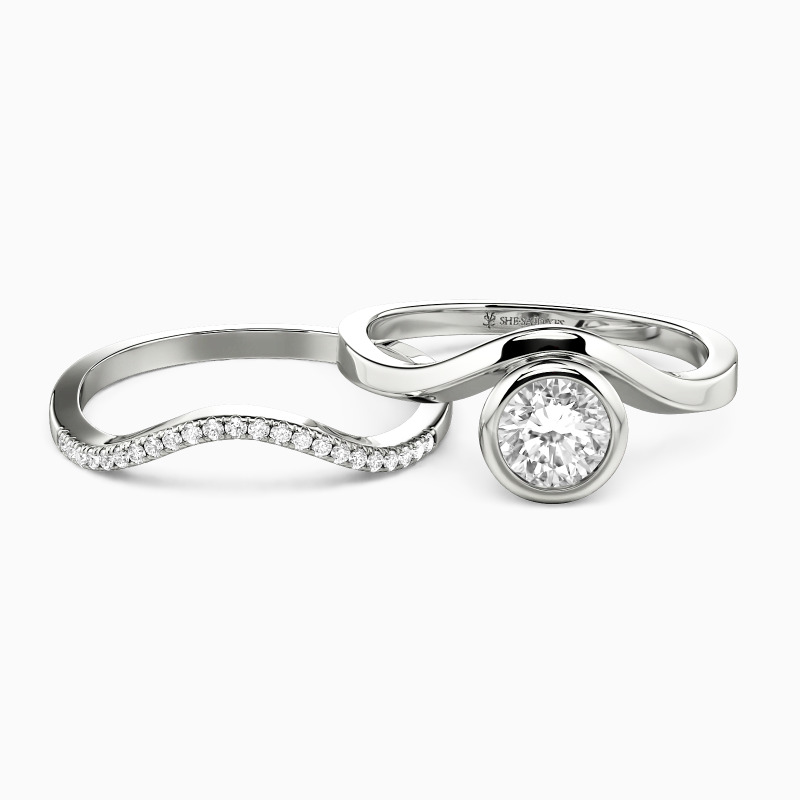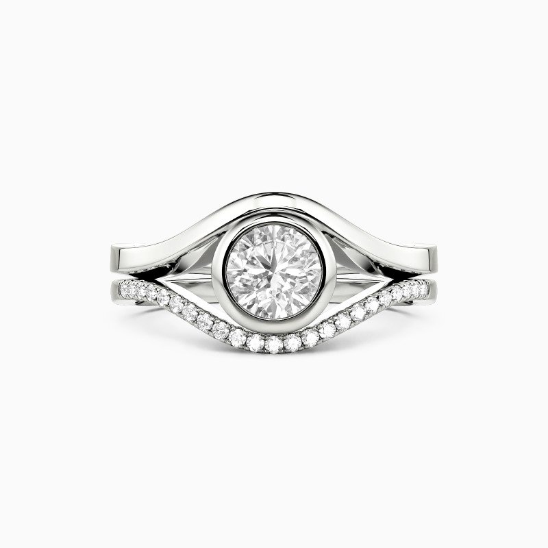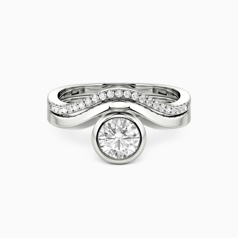 Ce set nuptial polyvalent incarne l'élégance moderne avec une touche d'originalité. La bague de fiançailles présente une pierre ronde dans un serti clos élégant, complétée par un anneau poli incurvé. L'alliance pavée assortie offre deux options de style : nichée parfaitement contre la bague de fiançailles pour plus d'éclat, ou retournée pour créer une intrigante silhouette d'œil du malin. Un ensemble vraiment adaptable pour la mariée contemporaine.