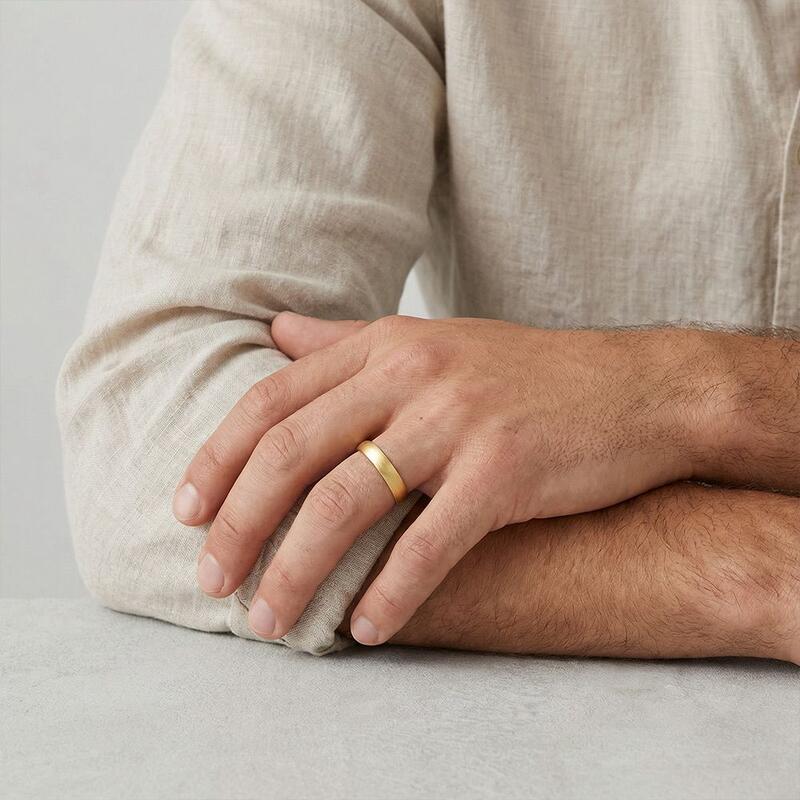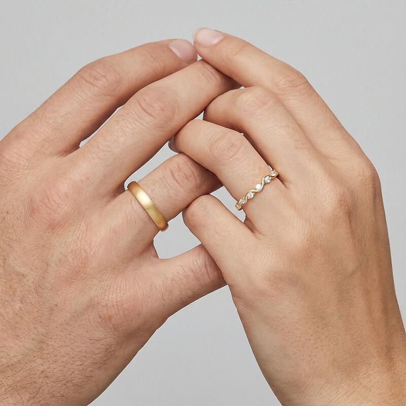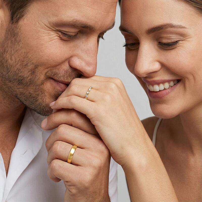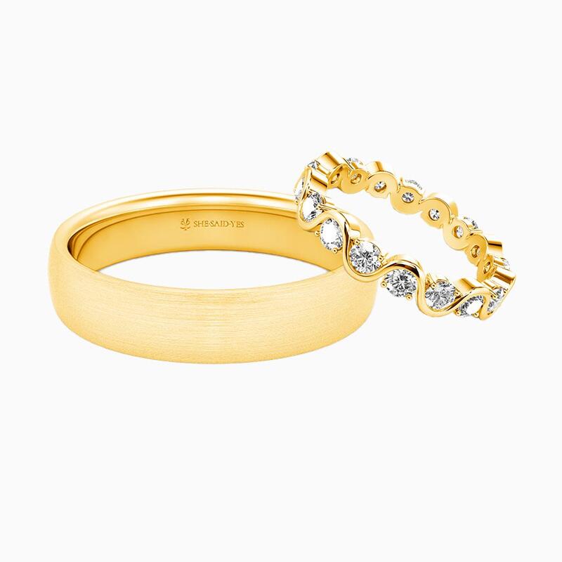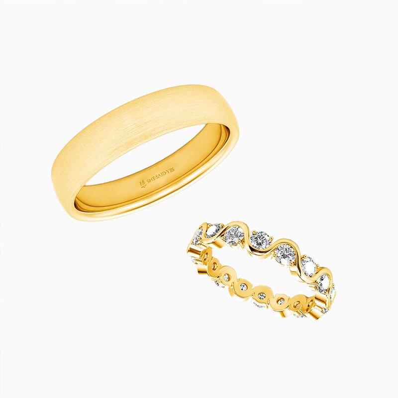 Un amour aussi fluide que la marée, aussi durable que l'horizon. Sa bague ondule en vagues gracieuses, chaque crête sertie d'un diamant qui capte la lumière comme l'écume de mer – douce mais éblouissante. Sa bague à lui est ancrée, son fini brossé évoquant une force tranquille, comme une pierre réchauffée par le soleil et polie par le temps. Ensemble, ils reflètent l'équilibre de l'amour : son mouvement, sa stabilité ; son éclat, sa profondeur. Une promesse murmurée de deux âmes en parfaite harmonie.