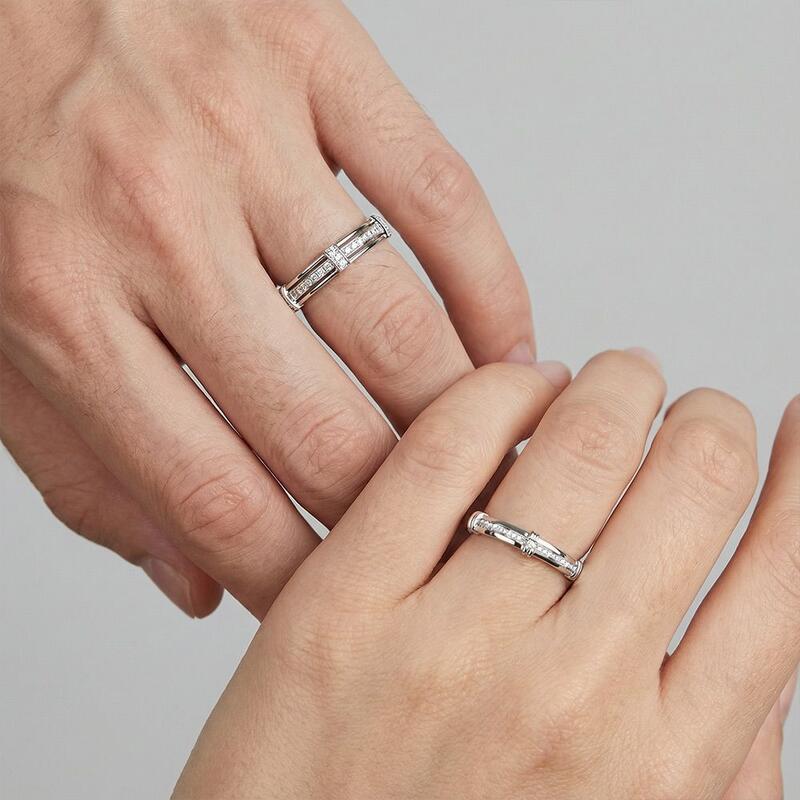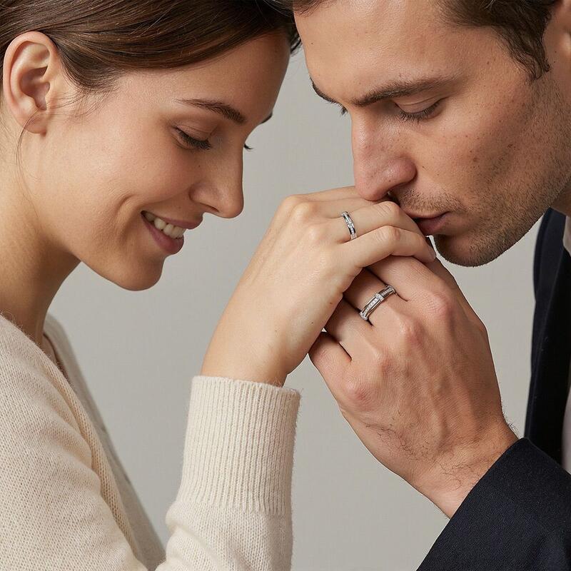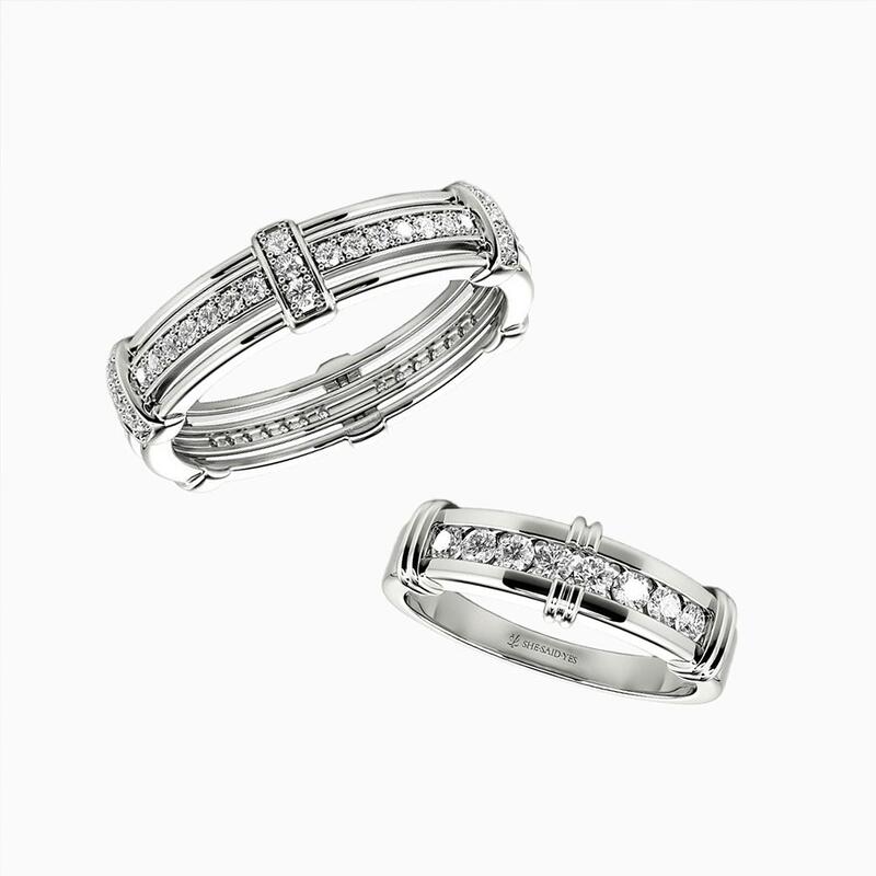 Ces alliances entrelacées célèbrent le lien indéfectible de l'amour. Le modèle féminin arbore trois nœuds élégants enserrant un délicat demi-cercle de diamants sertis en canal, captant la lumière avec une brillance subtile. Son homologue masculin renforce le thème avec six nœuds puissants encerclant le jonc, rehaussés d'une couronne complète de pierres étincelantes pour une présence forte mais raffinée. Ensemble, leur art nodal symbolise l'union, la force et une dévotion éternelle.