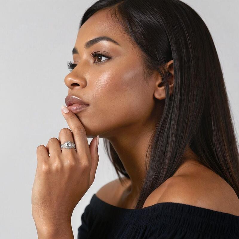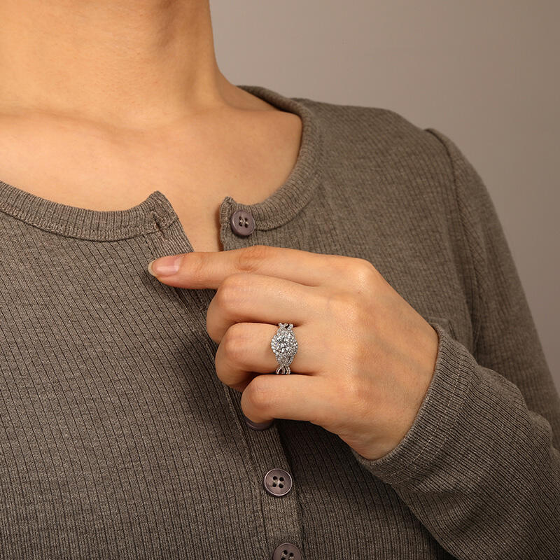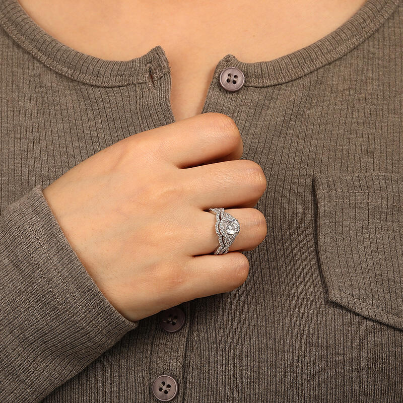 Bague de fiançailles halo à brancard torsadé, savamment courbée pour mettre en valeur la pierre centrale avec éclat. Fabriquée en métal précérieur durable avec des incrustations pavées étincelantes. Une alliance assortie complète cet ensemble nuptial élégant. Ce set sera toujours un choix parfait pour votre bien-aimée.