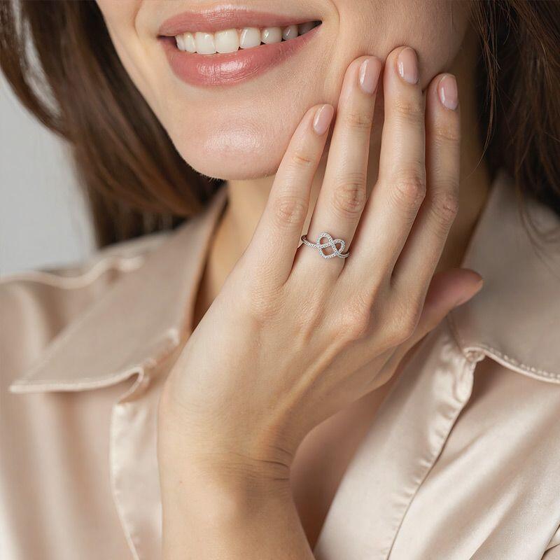 Moderne et élégante. Ce solitaire de fiançailles arbore un noeud corde original orné de pierres scintillantes qui s'étendent harmonieusement jusqu'à la monture, symbolisant un amour éternel et un engagement sans fin.