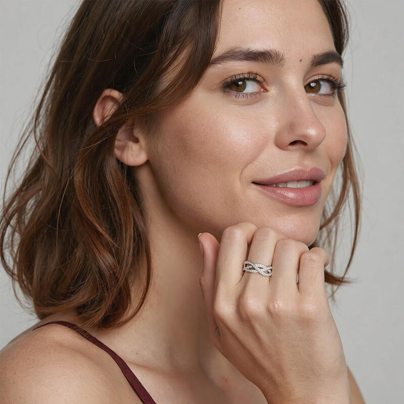 Cette alliance envoûtante est le choix idéal pour sceller vos nouveaux débuts. Un délicat design entrelacé révèle des rubans de pierres pavées qui composent une déclaration de style glamour. Offrez-lui cette étincelante surprise pour graver votre jour le plus précieux.