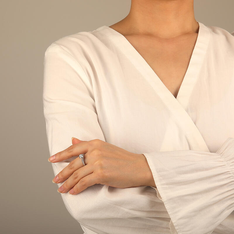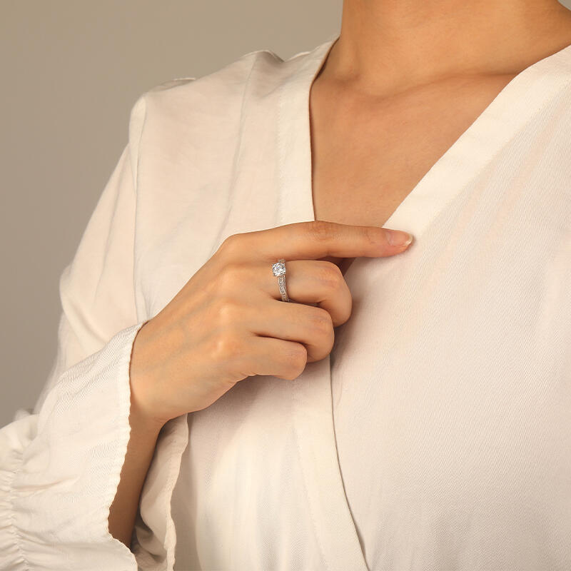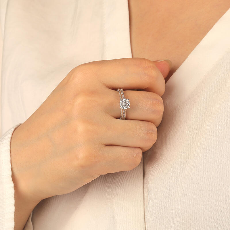 Ce somptueux anneau de fiançailles incarne une beauté irréfutable. Des gemmes étincelantes dévalent gracieusement en sertissage en canal de part et d'autre, mettant en valeur l'éclat de la pierre round-cut centrale qui confère une touche de luxe à cette pièce magistrale. Le choix ultime pour les occasions les plus mémorables.