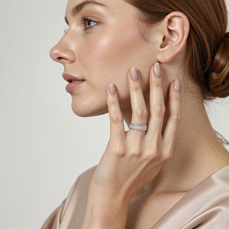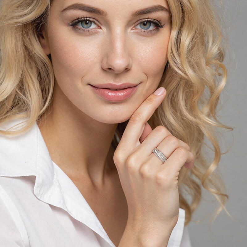 Bague éternité au design délicat pour un port quotidien. Une ligne centrale de pierres scintillantes serties en canal crée une brillance exceptionnelle, accompagnée de deux motifs cordage tressés. Son ergonomie raffinée assure un confort optimal. « Si j'étais poète, notre amour inspirerait mes plus beaux vers » – cette promesse gravée en fait un bijou intemporel.