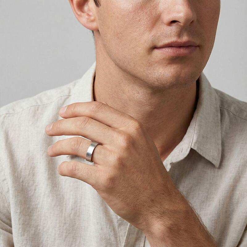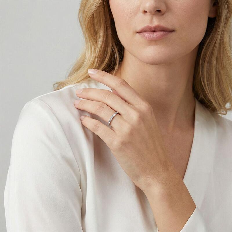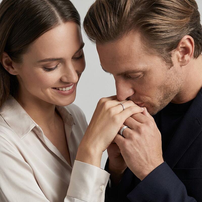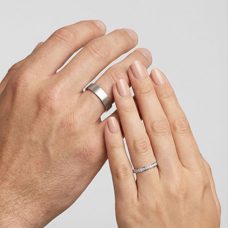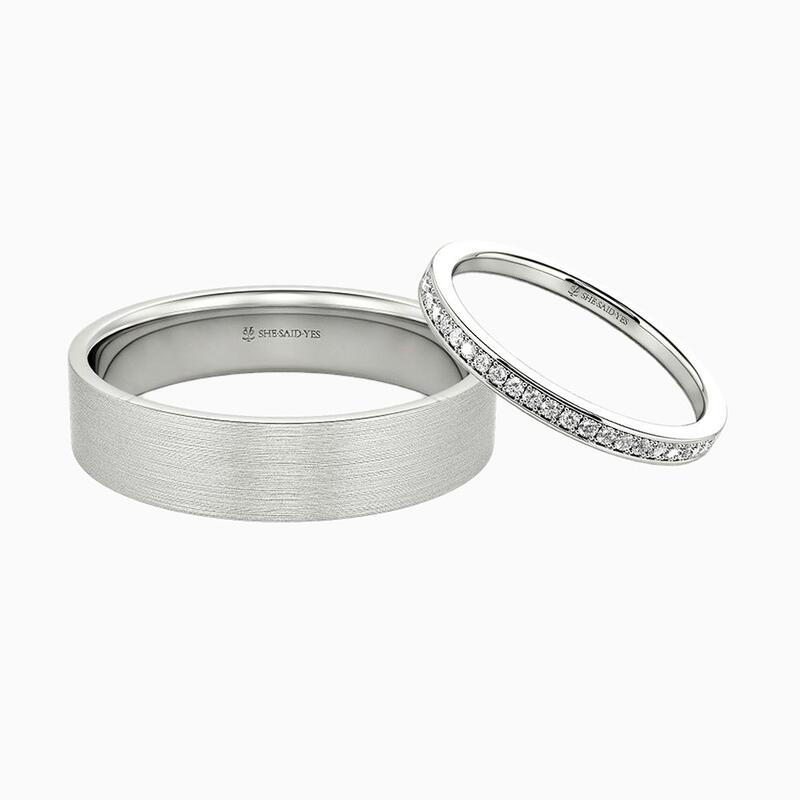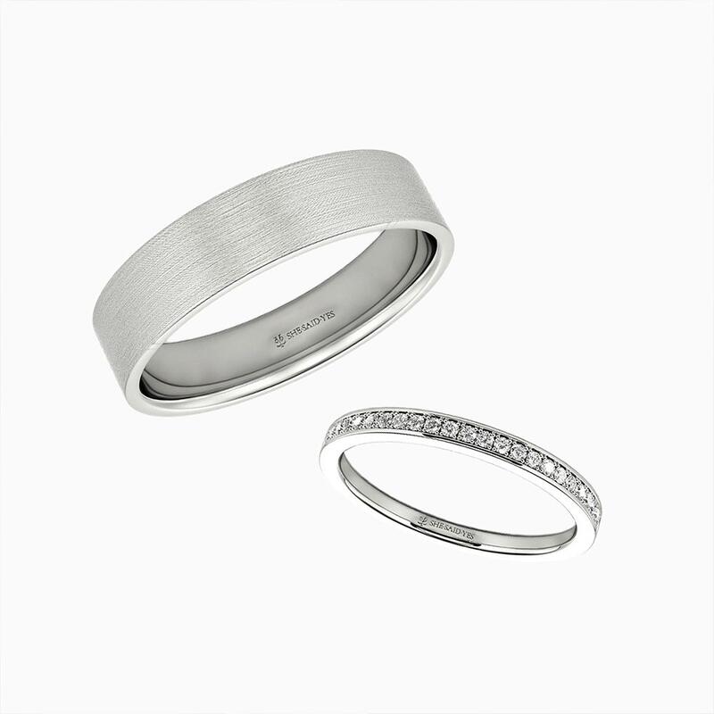 Ces bagues allient brillance et force avec une grâce naturelle. Sa bague droite éblouit avec un demi-cercle de pavés brillants, dispersant la lumière à chaque mouvement. Sa bague assortie ancre le design avec un fini brossé élégant – subtil mais frappant. Ensemble, ils reflètent l'équilibre parfait entre éclat et sophistication, un témoignage discret d'un amour durable.