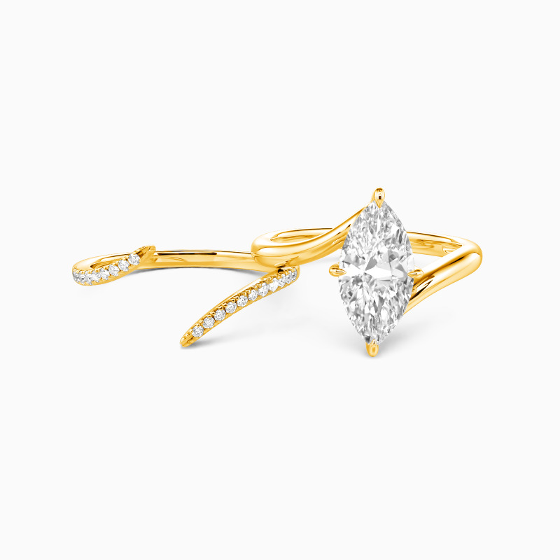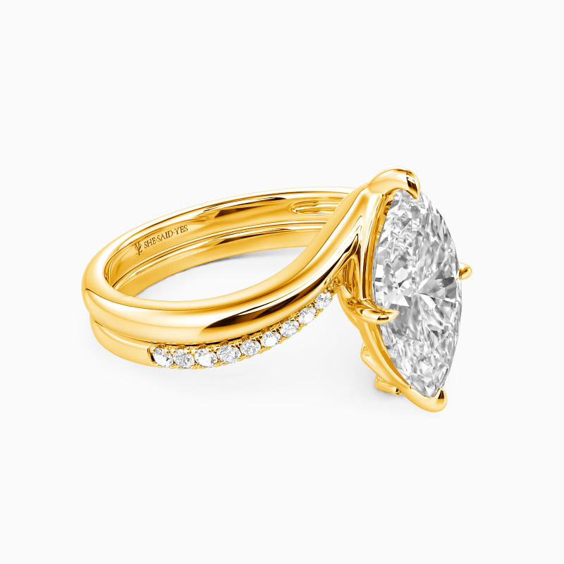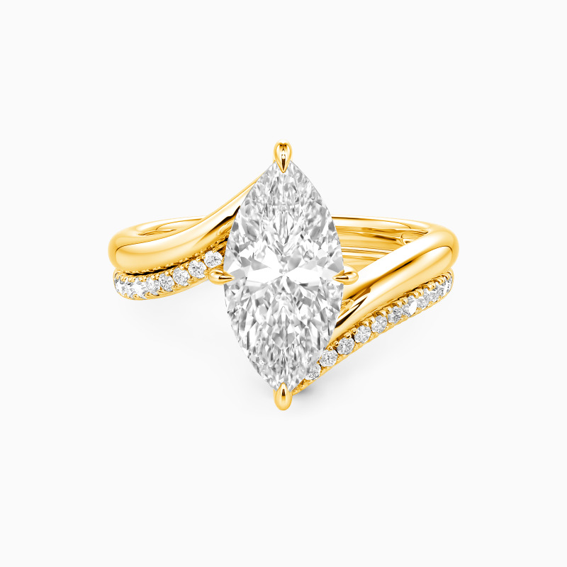 Ce set de mariage en 2 pièces allie harmonieusement élégance moderne et symbolisme romantique : une bague de fiançailles solitaire marquise saisissante associée à une alliance bypass délicate. Le design épuré de la bague de fiançailles guide le regard vers son diamant marquise étincelant, tandis que l'alliance ouverte sertie de pavé épouse ses courbes avec grâce. Ensemble, ils créent une union fluide – intemporelle mais contemporaine, parfaite pour la mariée qui aime les lignes organiques et le sophistication discrète.