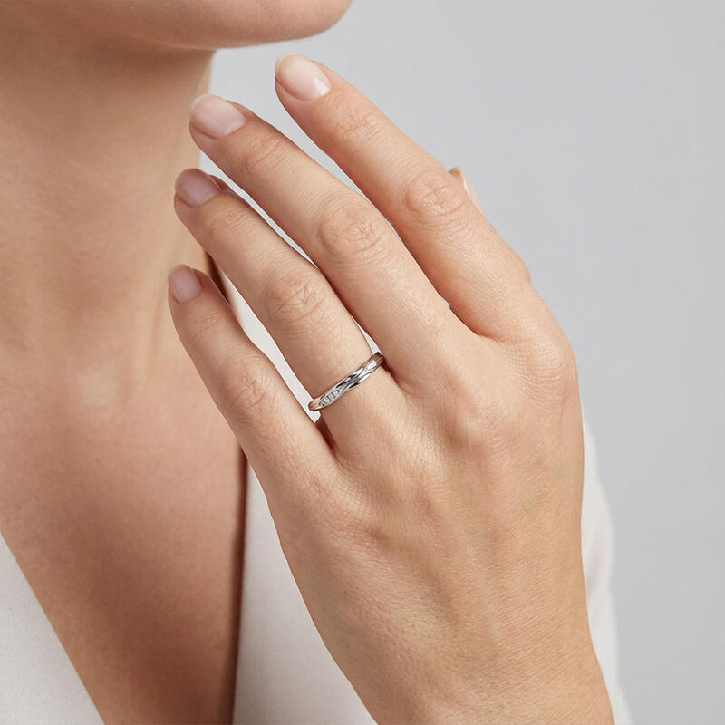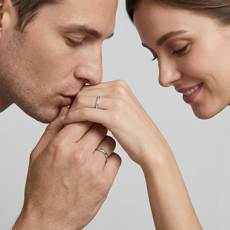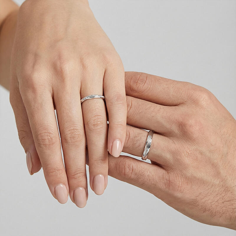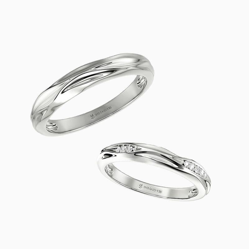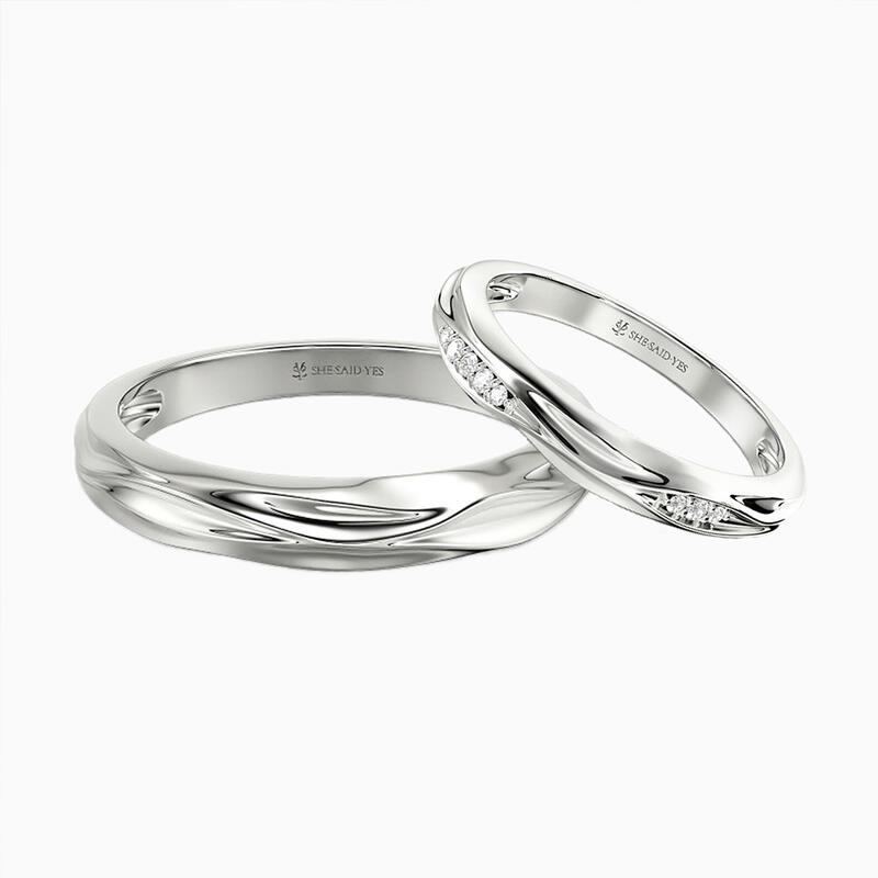 Telles des gouttes jumelles se rencontrant dans l'eau, ces alliances captent la danse éternelle de la connexion. Leur surface ondulée reflète une lumière liquide, tandis que la sienne scintille de diamants dispersés – comme la lumière du soleil sur des vagues fugitives. Un hommage poétique à la douce et durable résonance de l'amour.