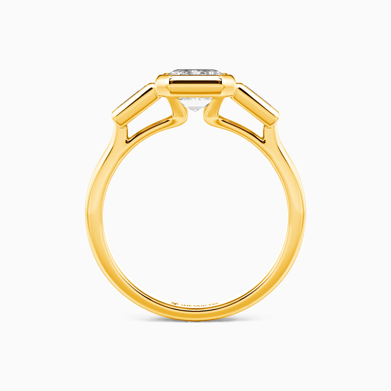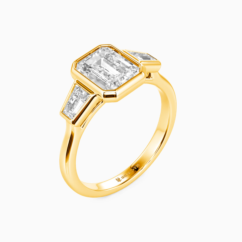 Trois pierres lumineuses dansent en parfaite harmonie - un audacieux centre taille émeraude flanqué de trapèzes angulaires, leur géométrie nette adoucie par des sertis clos fluides. Le pont ouvert crée un équilibre délicat, permettant à la lumière de cascader à travers le design. Une tournure moderne de la romance classique, cette bague capture l'amour durable avec une grâce architecturale.