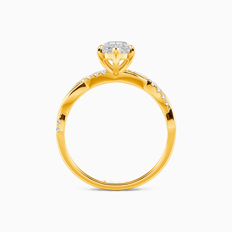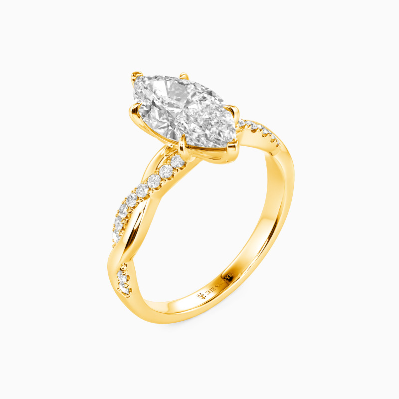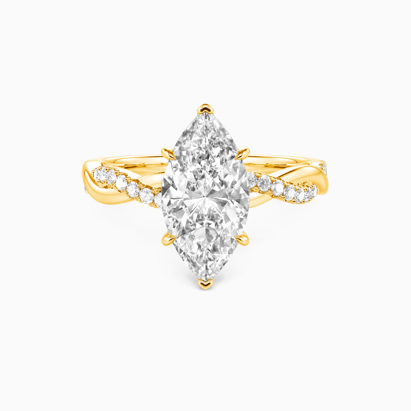 Cette bague de fiançailles présente une pierre centrale marquise frappante, élégamment allongée pour rehausser son éclat. Le délicat bandeau torsadé ajoute une touche de complexité romantique, tandis qu'une seule rangée de diamants pavés rehausse subtilement l'éclat général. Un mélange parfait de sophistication contemporaine et de beauté intemporelle, conçu pour symboliser un amour éternel.