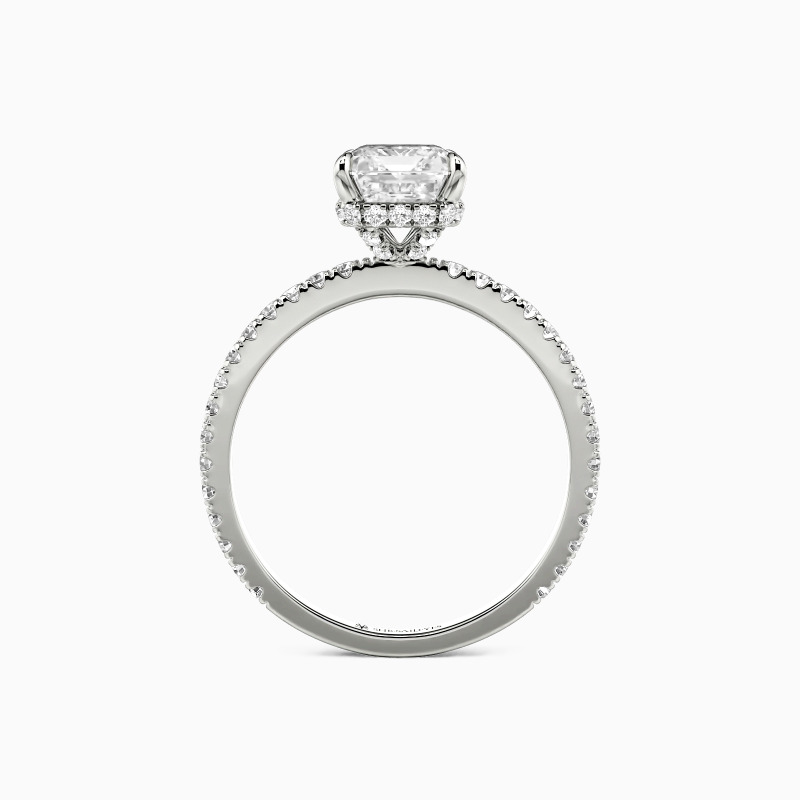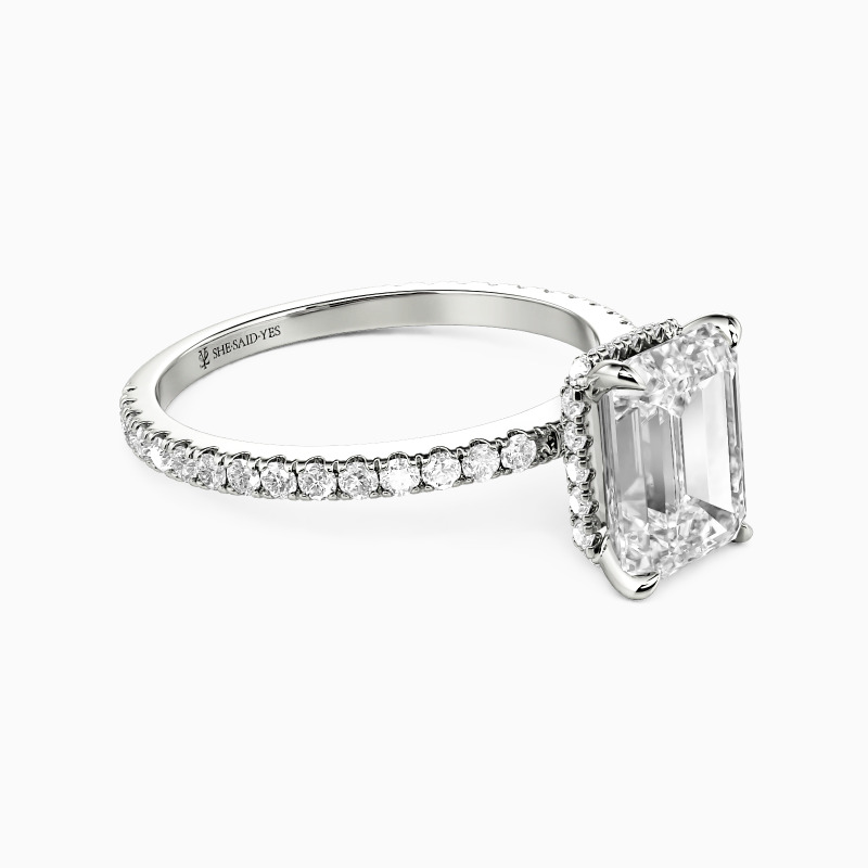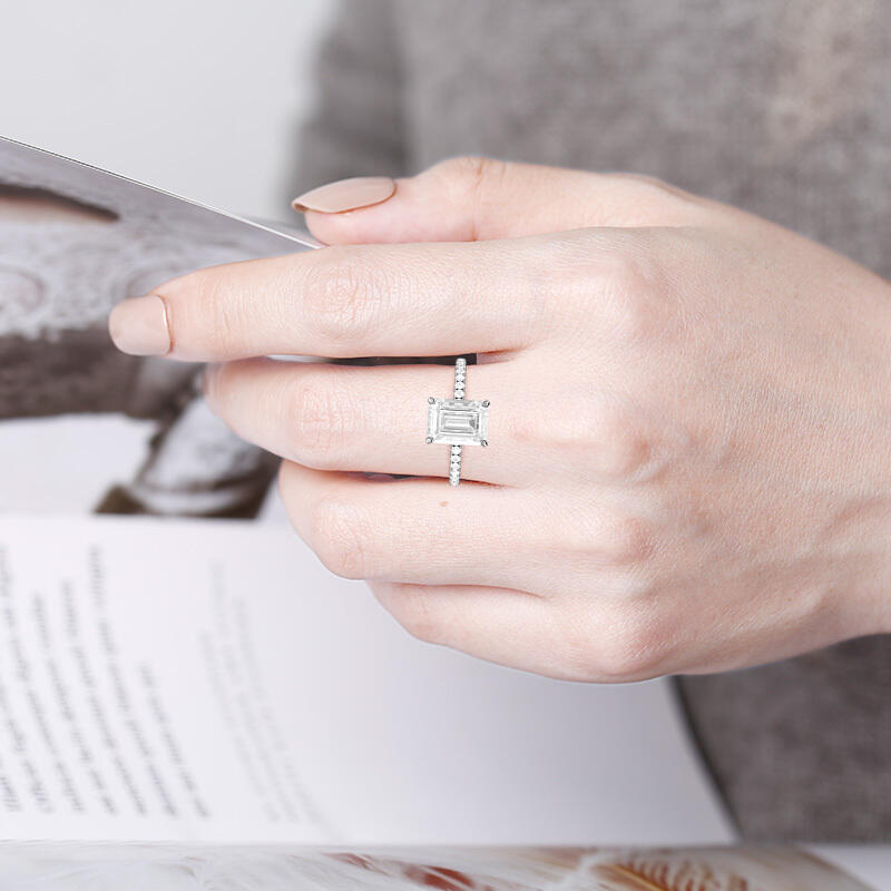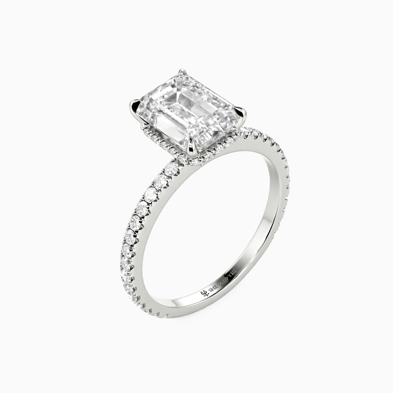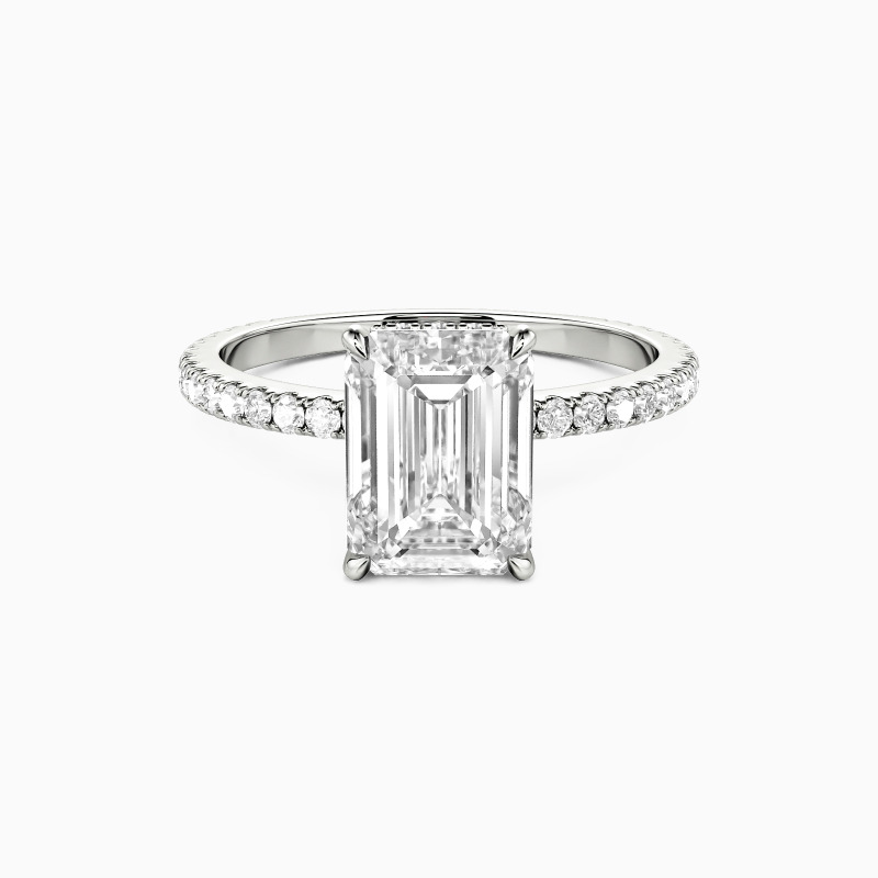 Une étude en luxe discret, cette bague de fiançailles présente une élégante pierre centrale émeraude coupée, nichée dans un panier pavé et se fondant harmonieusement dans un anneau pavé. Le jeu de lumière sur chaque facette crée une brillance subtile - un design qui en dit long dans une simplicité raffinée.