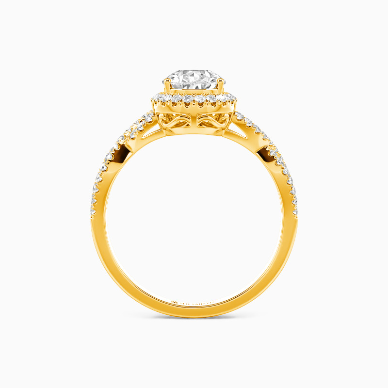 Cette bague halo unique présente une pierre centrale en forme de poire et une monture délicatement torsadée, alliant simplicité et élégance. Les pierres du halo environnant rehaussent la pierre centrale, tandis que le motif végétal gravé sur le côté du panier crée un style vintage.