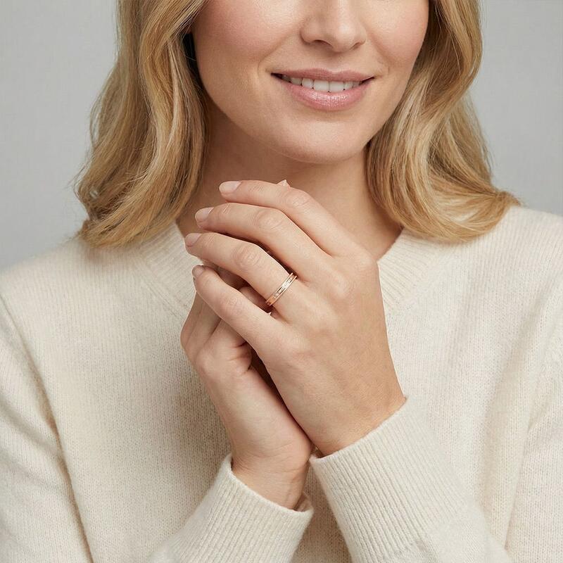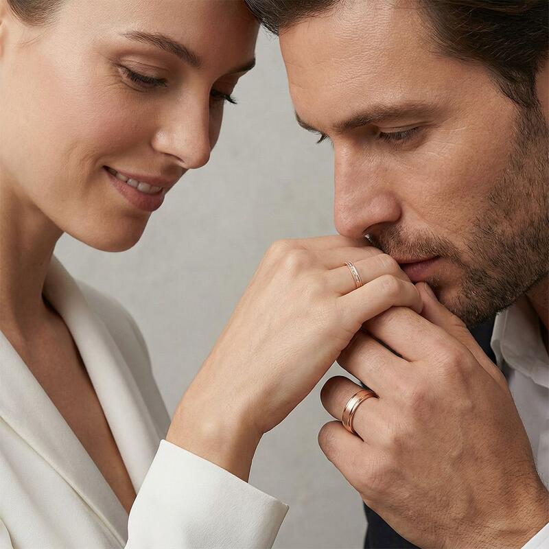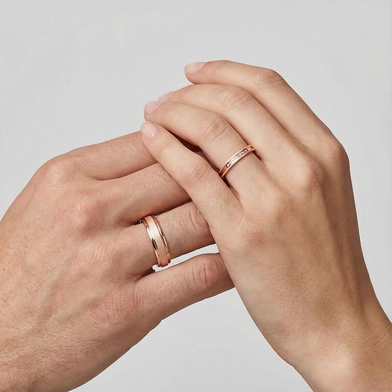 Une paire d'alliances harmonisant les contrastes, alliant texture robuste et éclat radieux. La sienne attire le regard avec ses bords à marches audacieuses, sa surface sablée dégageant un charme mat moderne, tandis que les bords polis captent la lumière avec une netteté frappante. La sienne reflète élégamment son esthétique – des côtés sablés encadrant un centre poli étincelant, où sept diamants délicats scintillent comme une constellation. Ensemble, ils équilibrent force et douceur, symbole de la dualité de l'amour.